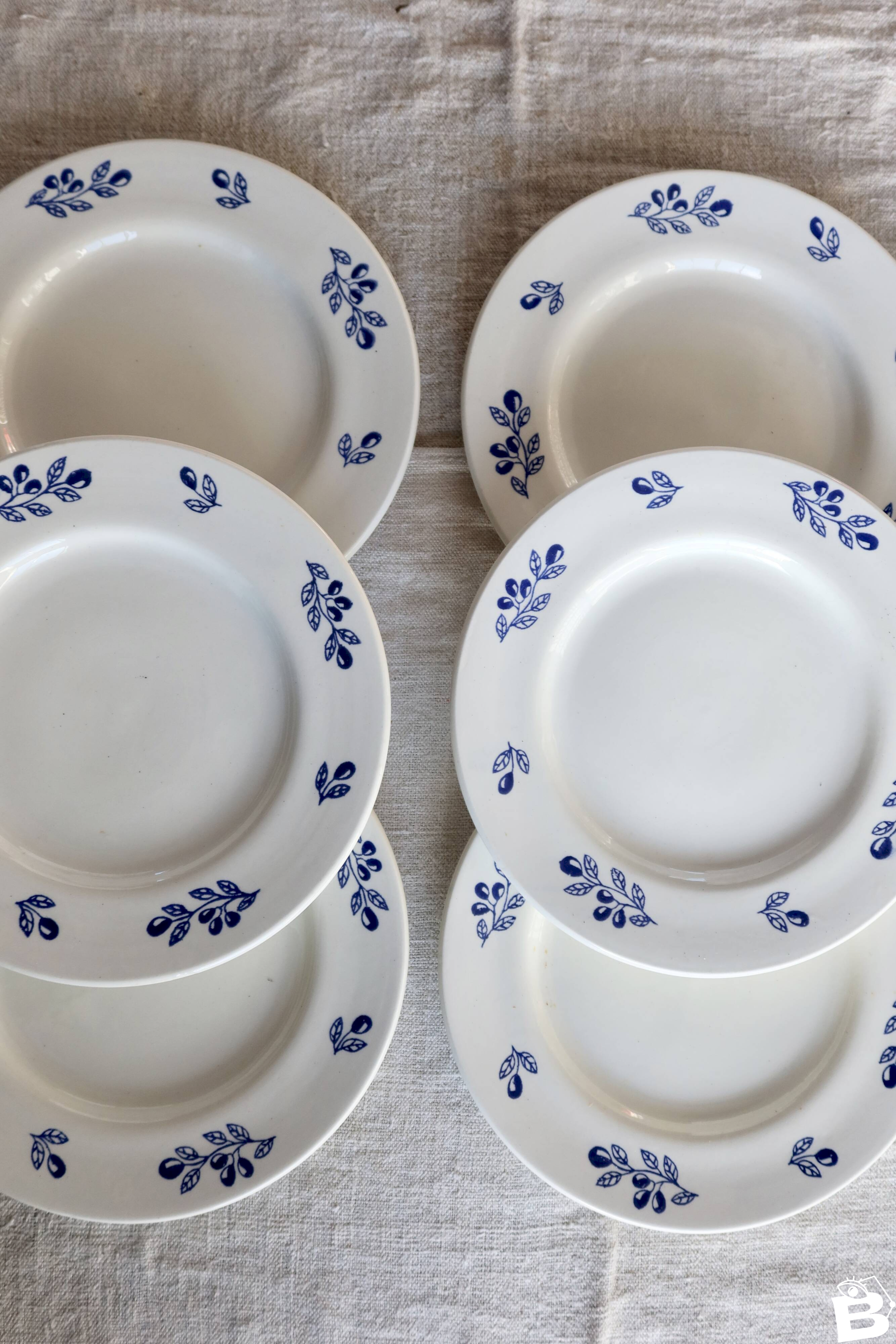 6 assiettes à dessert vintage faïence ivoire - Motif olives bleues