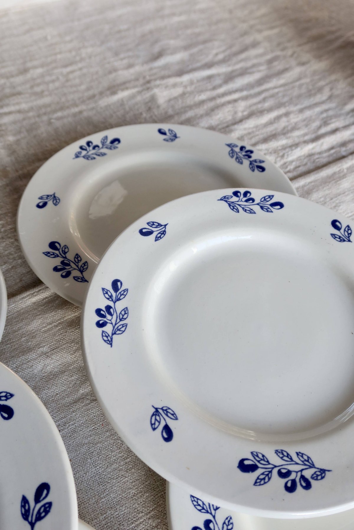 6 assiettes à dessert vintage faïence ivoire - Motif olives bleues Céramique