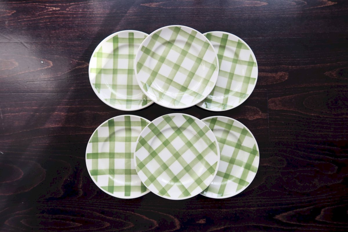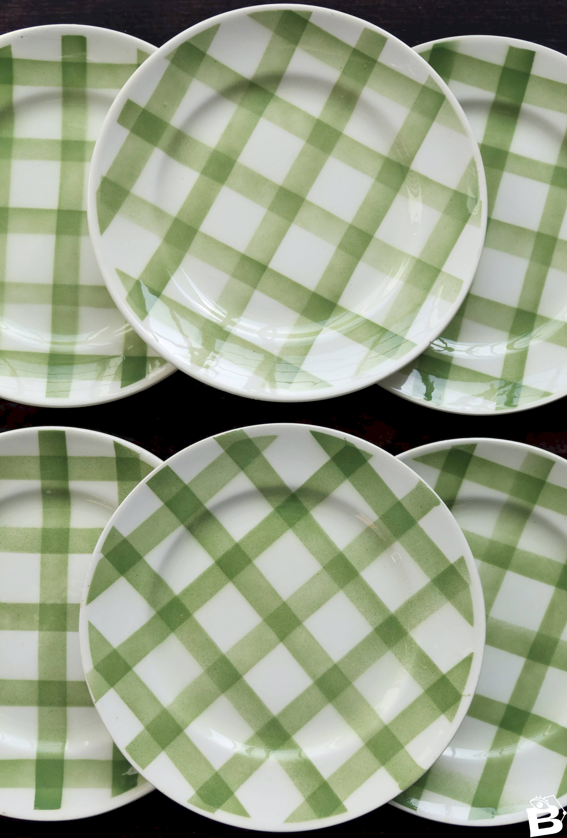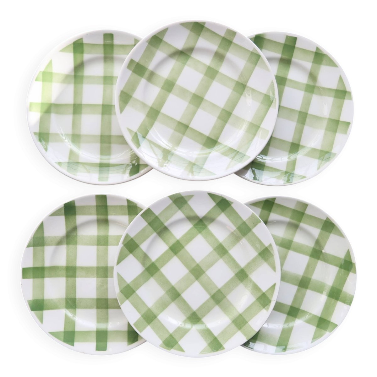 Belle suite de 6 assiettes à dessert en faïence blanche à grand décor de carreaux vert prairie, graphisme frais façon nappe de campagne.Bel état d’ensemble avec légères traces d’usage et petites marques de surface liées au temps.Diamètre: 19, 5cm.