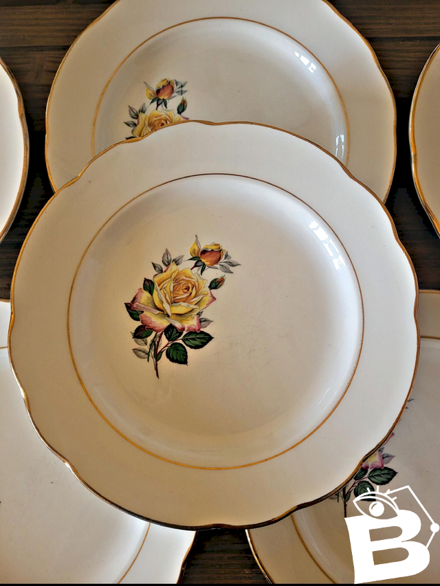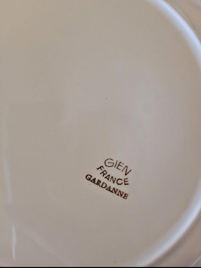 6 assiettes plates Gien, modèle Gardanne.Leur décor de roses jaunes, associé à deux liserés dorés — l’un sur le pourtour, l’autre à l’intérieur de l’assiette — apporte une touche raffinée et lumineuse à une table du quotidien comme aux grandes occasions.Les bords légèrement festonnés renforcent l’élégance du modèle et rappellent le savoir-faire traditionnel de la Faïencerie de Gien.Ces assiettes présentent un bel état général, avec de légères marques d’usage liées au temps et à l’utilisation (traces de couvert), typiques de la vaisselle ancienne.Le liseré et le dessin sont en bon état.Des assiettes creuses, des raviers, une saucière et différents plats sont également disponibles.? diamètre 24 cm X hauteur 2, 5 cm environ.Poids des 6 assiettes: environ 2650 gr.