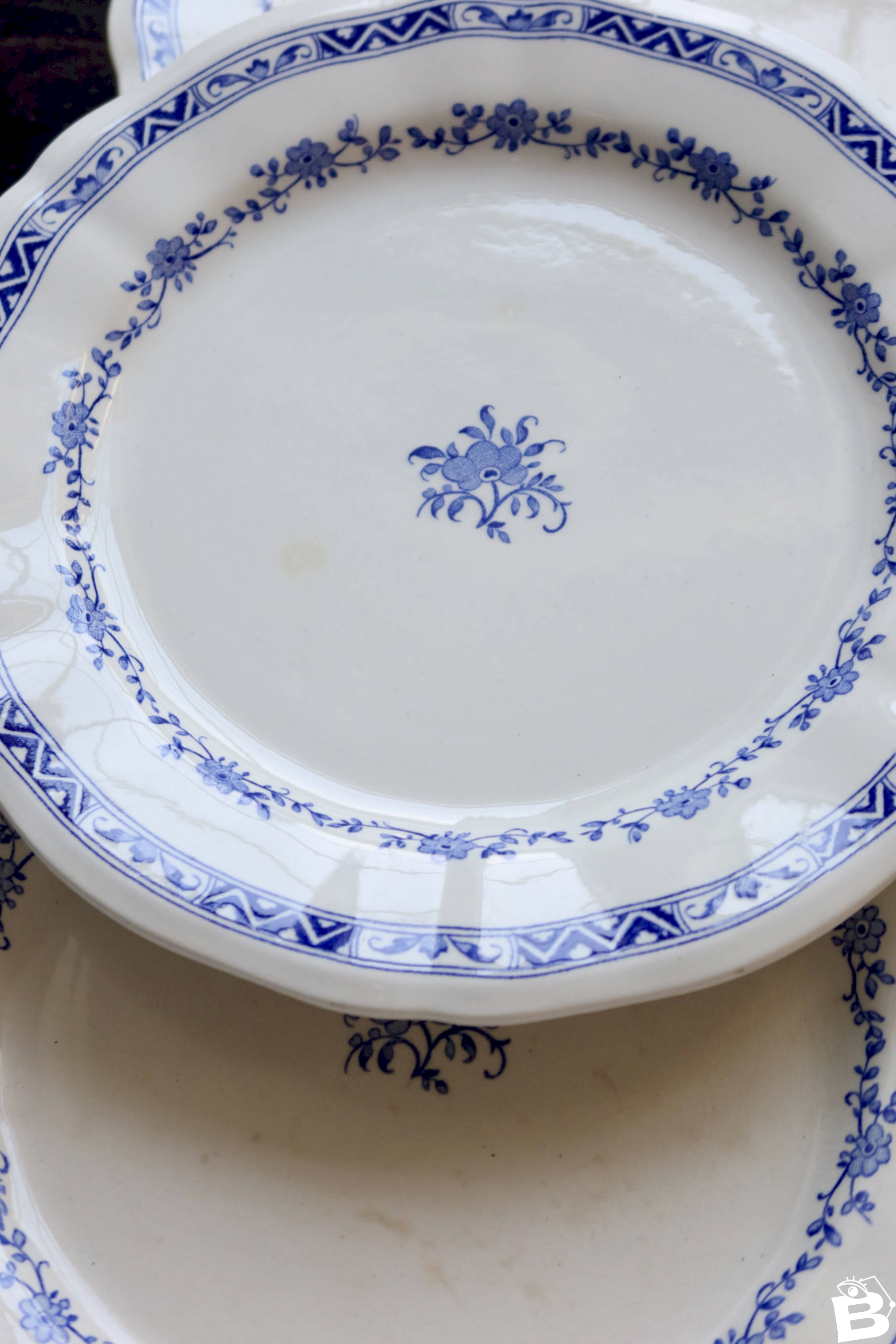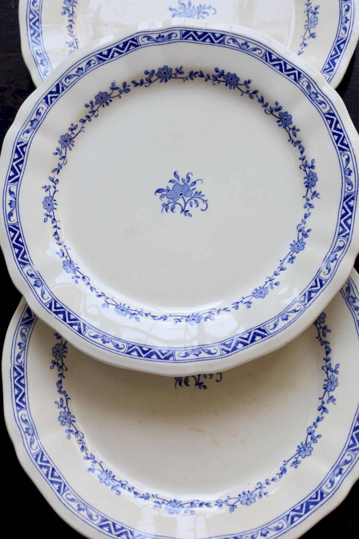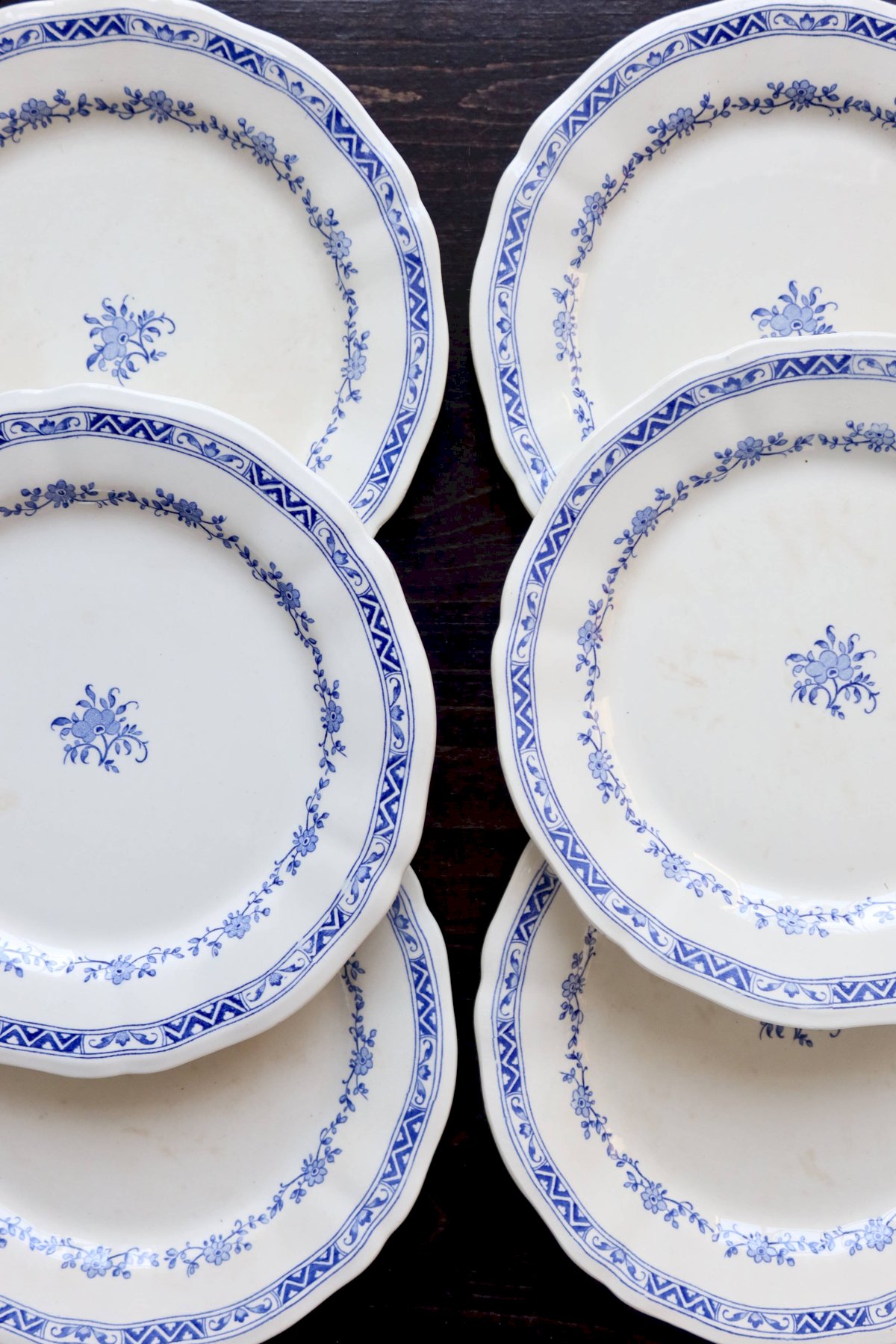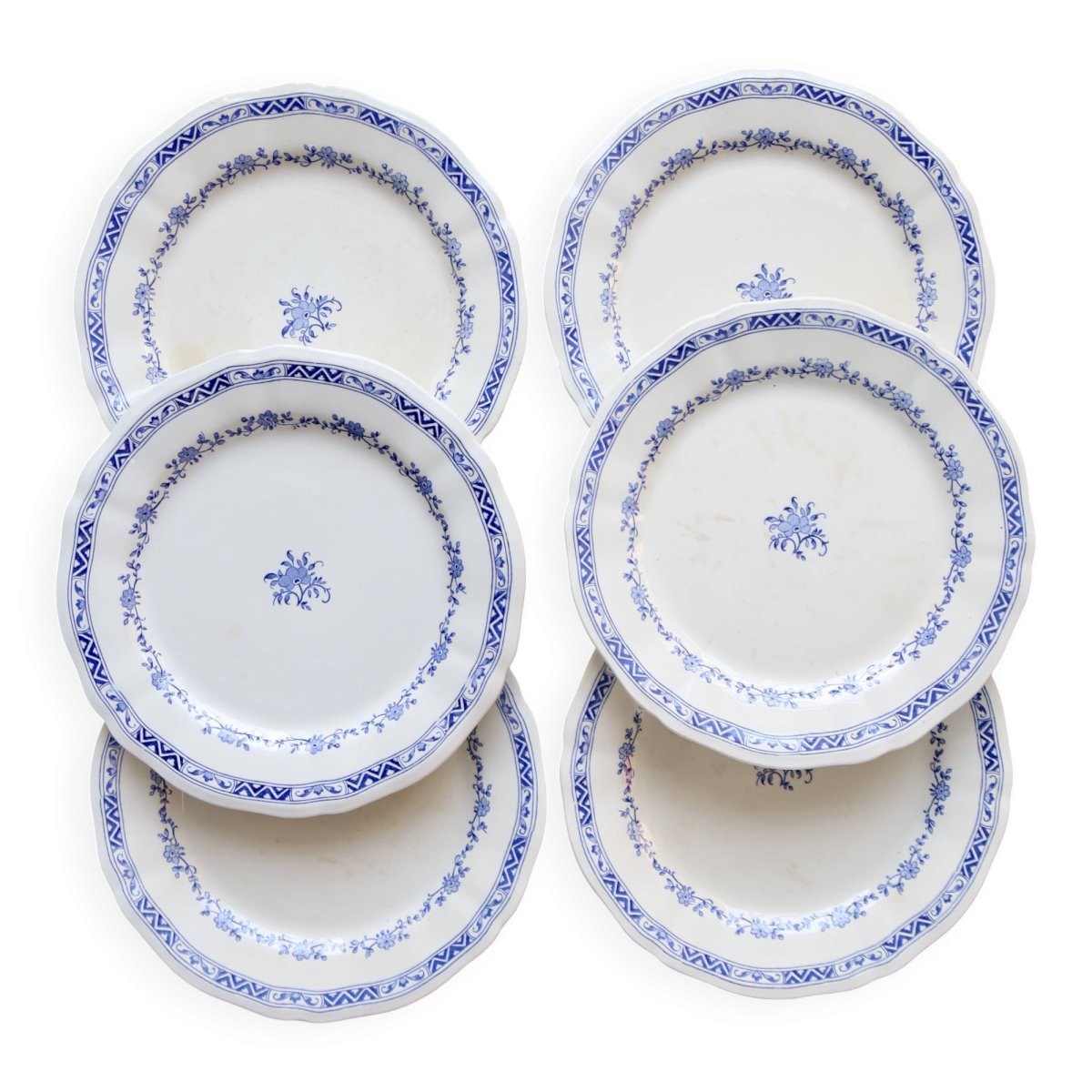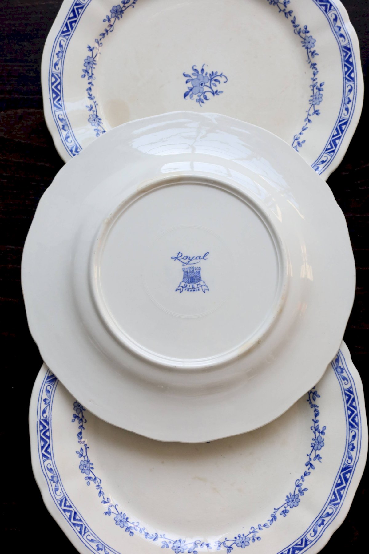 Suite de 6 assiettes plates Gien – modèle “Royal” en faïence ivoire, bord chantourné et double frise: guirlande de petites fleurs bleues et bandeau géométrique sur le marli, fleuron central assorti.État global excellent pour un service ancien, avec seulement de très légères marques d’usage et quelques micro-points d’émail (rien de structurant).3 lots identiques disponibles pour composer un grand service.