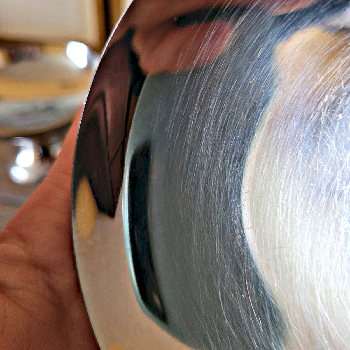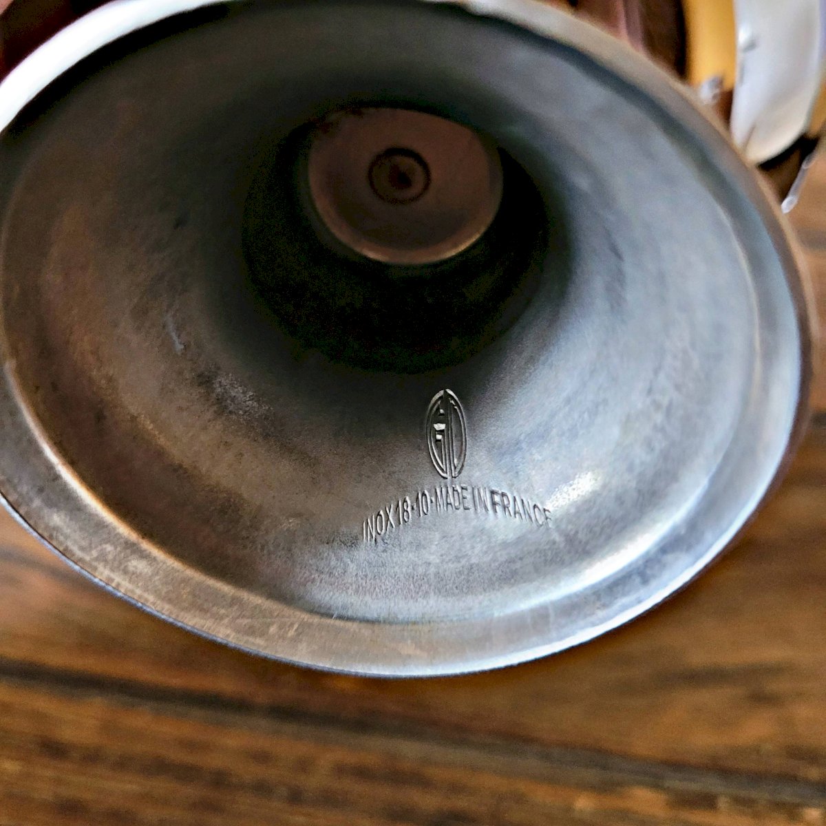 Signées Guy Degrenne, inox 18/10 fabriqué en France.Coupe ronde basse, pied “cône”.Elles ont été utilisées et présentent donc des marques de couvert (voir les photos).