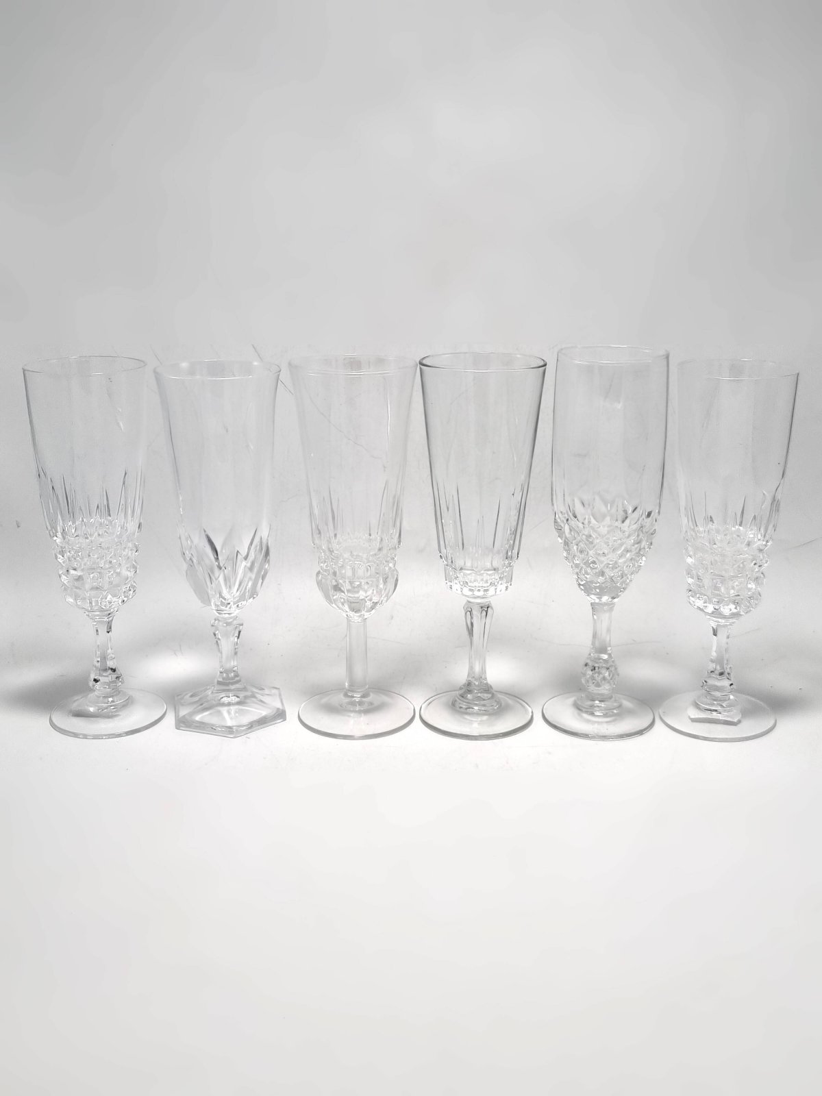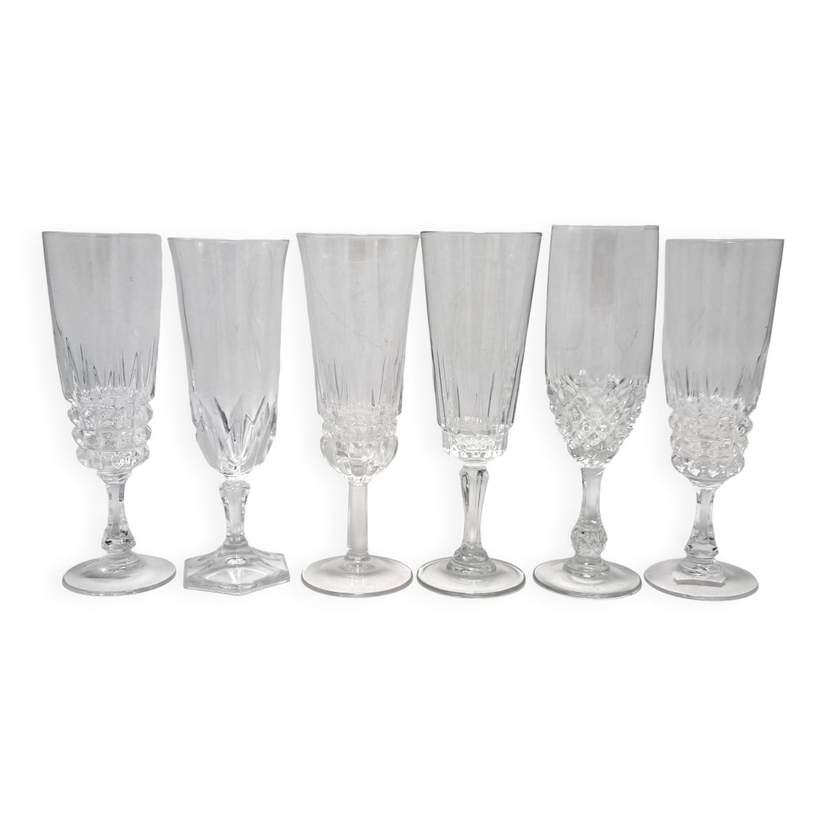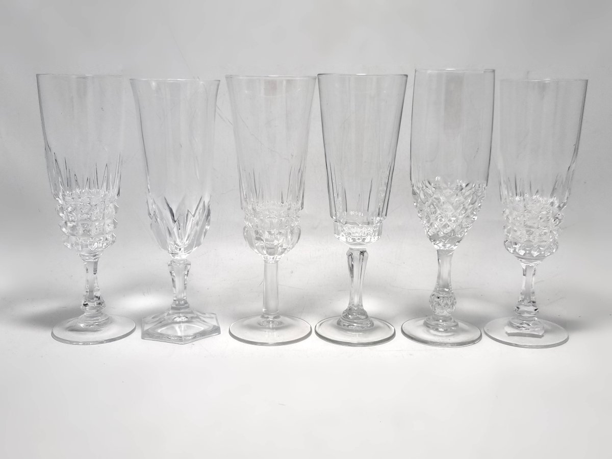 Ensemble de 6 flûtes à champagne dépareillé, certaines sont en verre, d'autres en cristal, 2 sont identiques.