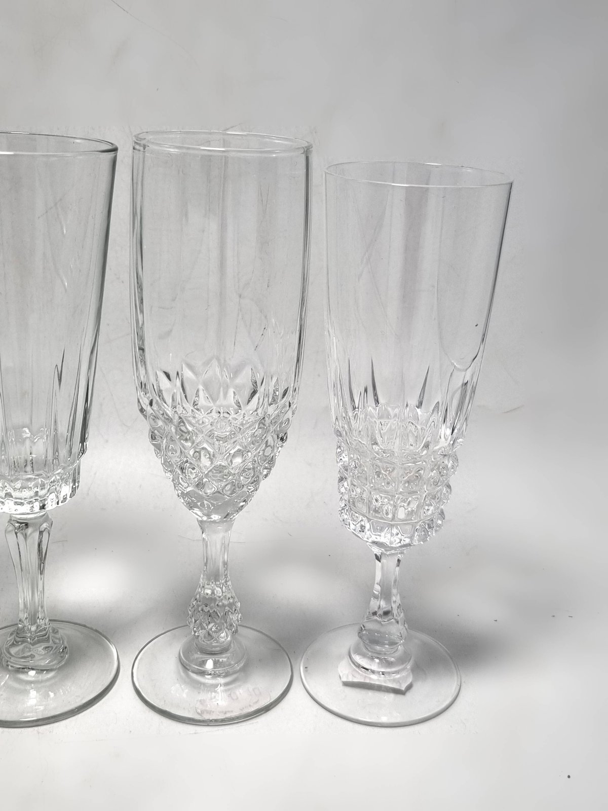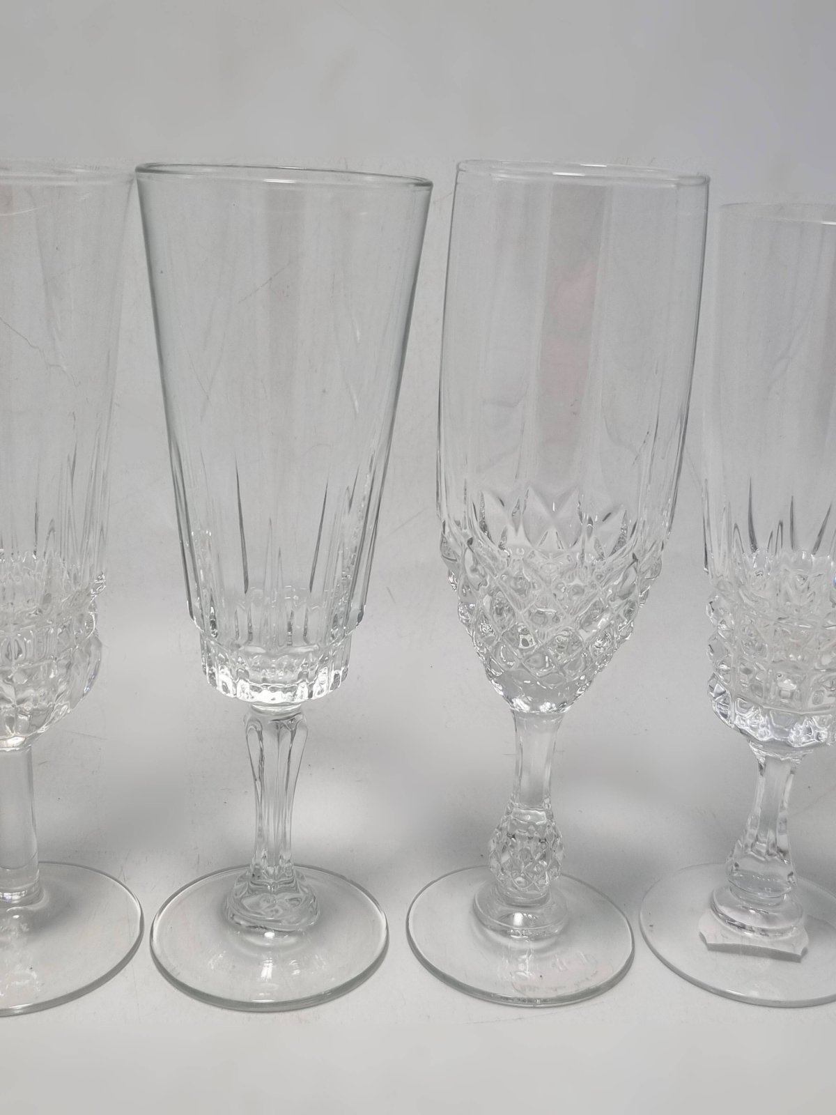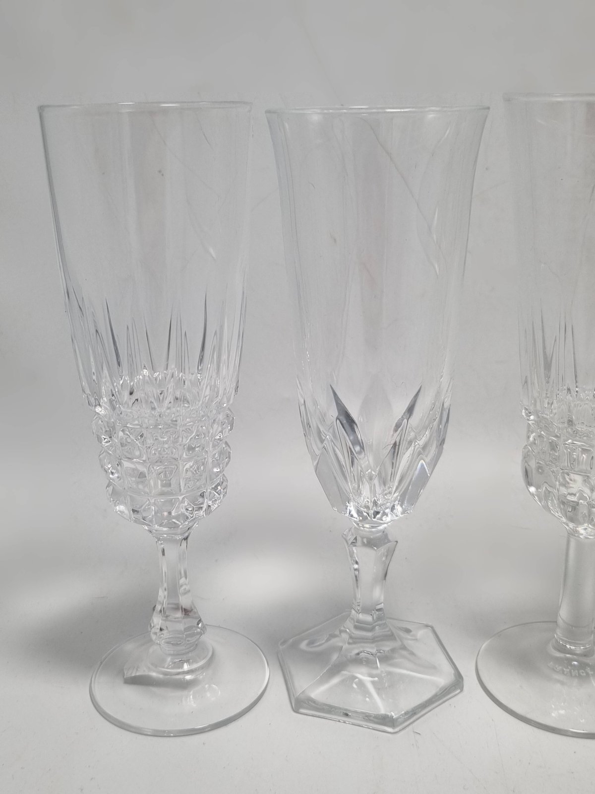 Ensemble de 6 flûtes à champagne dépareillé, certaines sont en verre, d'autres en cristal, 2 sont identiques.