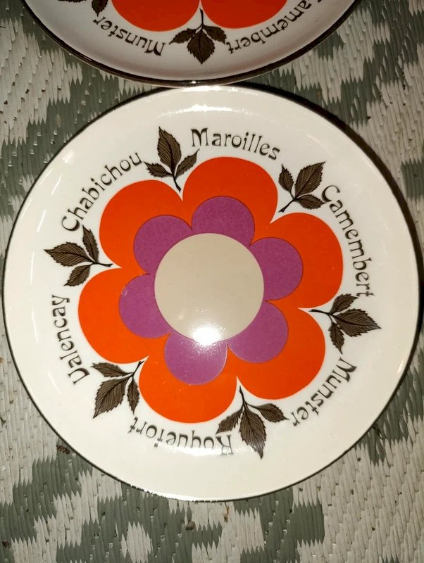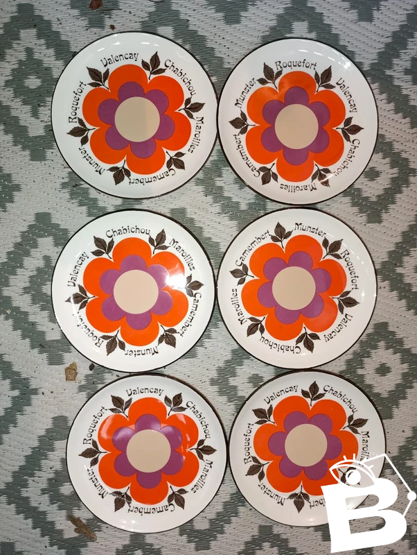 6 magnifiques assiettes à fromage/salade céramique GIEN modèle Harmonie en bon etat création Marie-Pierre Boitard années 70, couleur ivoire avec les noms de divers fromages une ou deux micro egrenures sur un coutour diamettre 19cm possibilité de reduire le transport en changeant de categorie...
