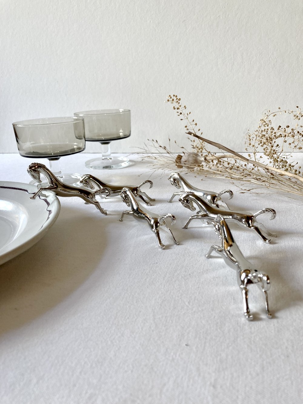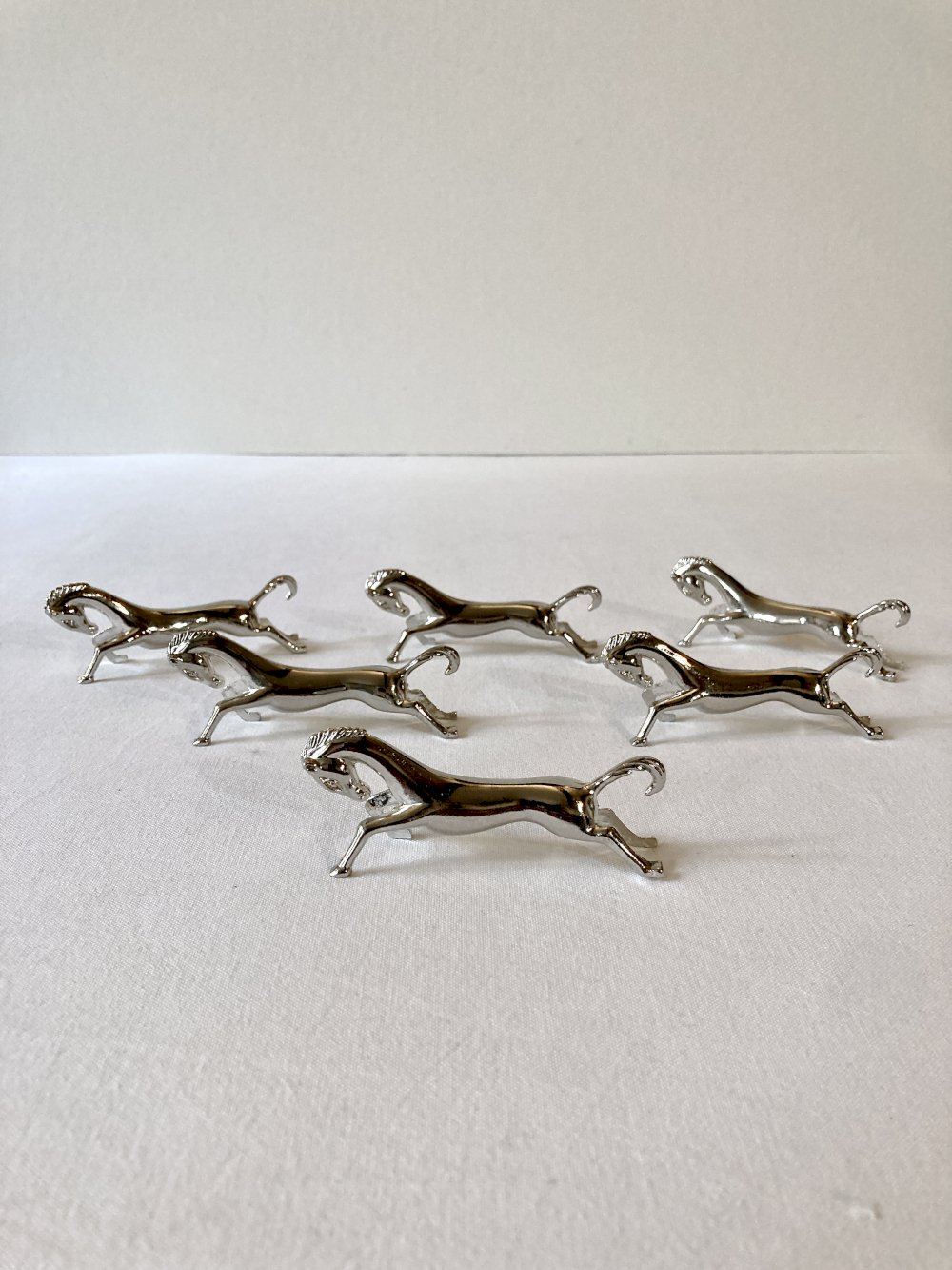 6 porte-couteaux en métal argenté en forme de cheval. Années 1960 Animal