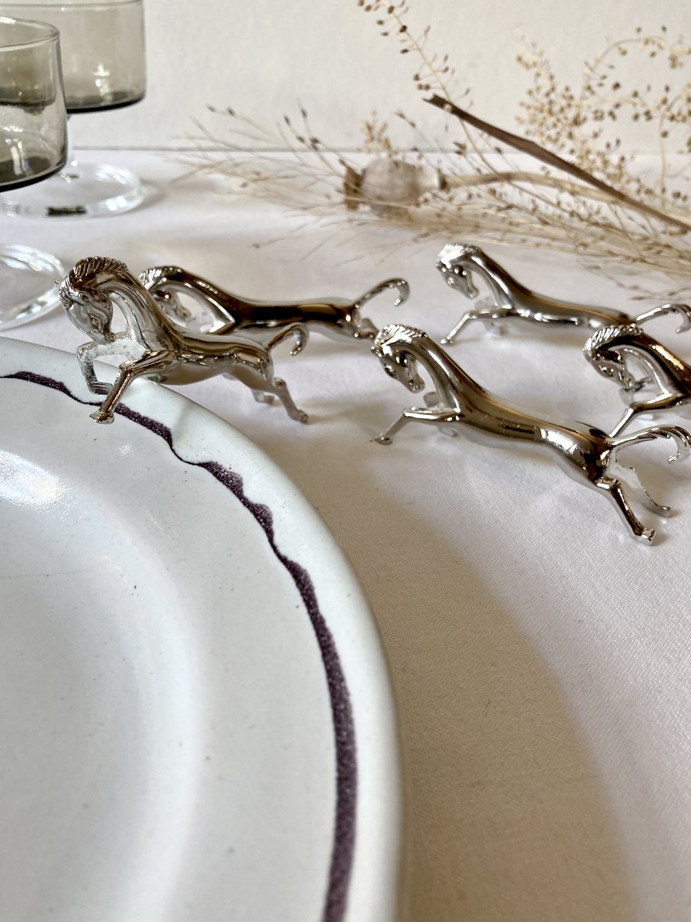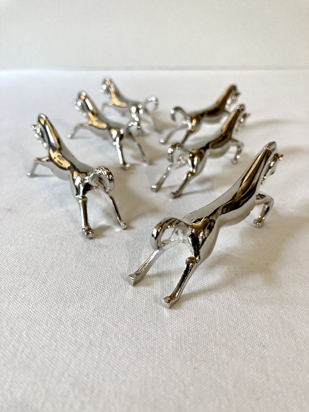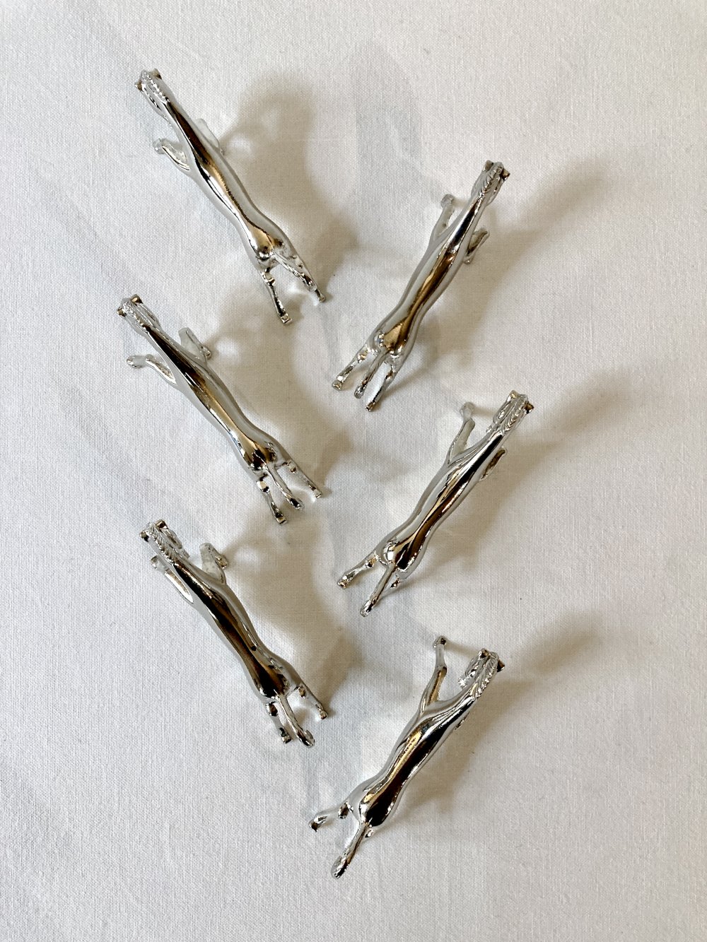 Ensemble de 6 porte-couteaux en forme de cheval de course, en métal argenté. Années 1960.