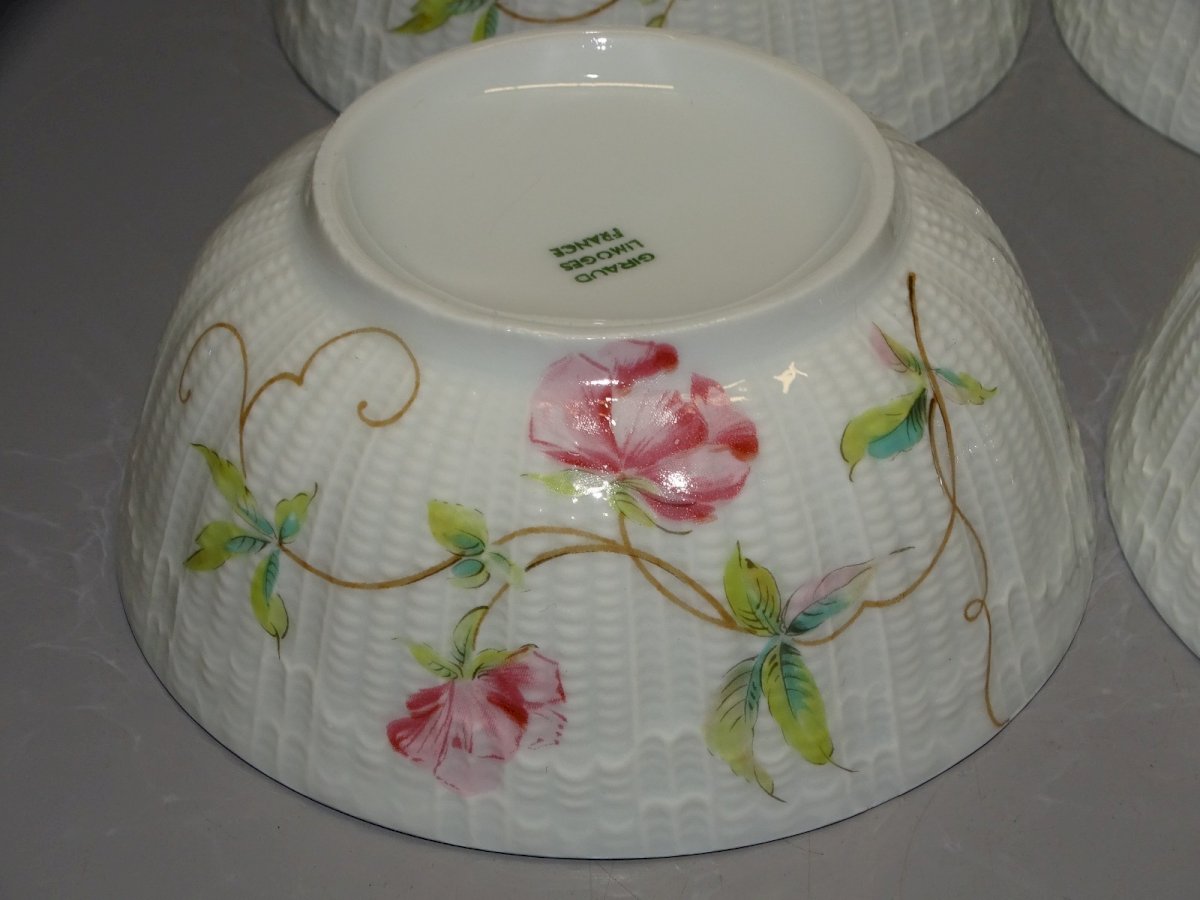 6 jolies coupes en porcelaine de Limoges Giraud  ( voir photos ) - jus de trouvailles,  sorties de grenier - en bon état d'usage -  Réf.42141025/67  - 6 autres identiques disponibles voir dernière photo - Diamètre 11,7 cm Hauteur 5 cm - Poids 0,834 kg  -   EXPEDITION en Mondial Relay OU Colissimo possible sur demande   EMBALLAGE GARANTI très protecteur  MERCI de BIEN REGARDER TOUTES les PHOTOS car ELLES FONT PARTIE INTEGRANTE de la DESCRIPTION et PERMETTENT de VOIR l'OBJET AU MIEUX - État:Occasion: Objet ayant été utilisé. Objet présentant quelques marques d'usure superficielle, ...Occasion: Objet ayant été utilisé. Objet présentant quelques marques d'usure superficielle, entièrement opérationnel et fonctionnant correctement. Il peut s'agir d'un modèle de démonstration ou d'un objet retourné en magasin après une courte période d'utilisation. les éventuelles imperfections. Couleur:Multicouleur Marque:Limoges Type:COUPELLE Matériau:Porcelaine