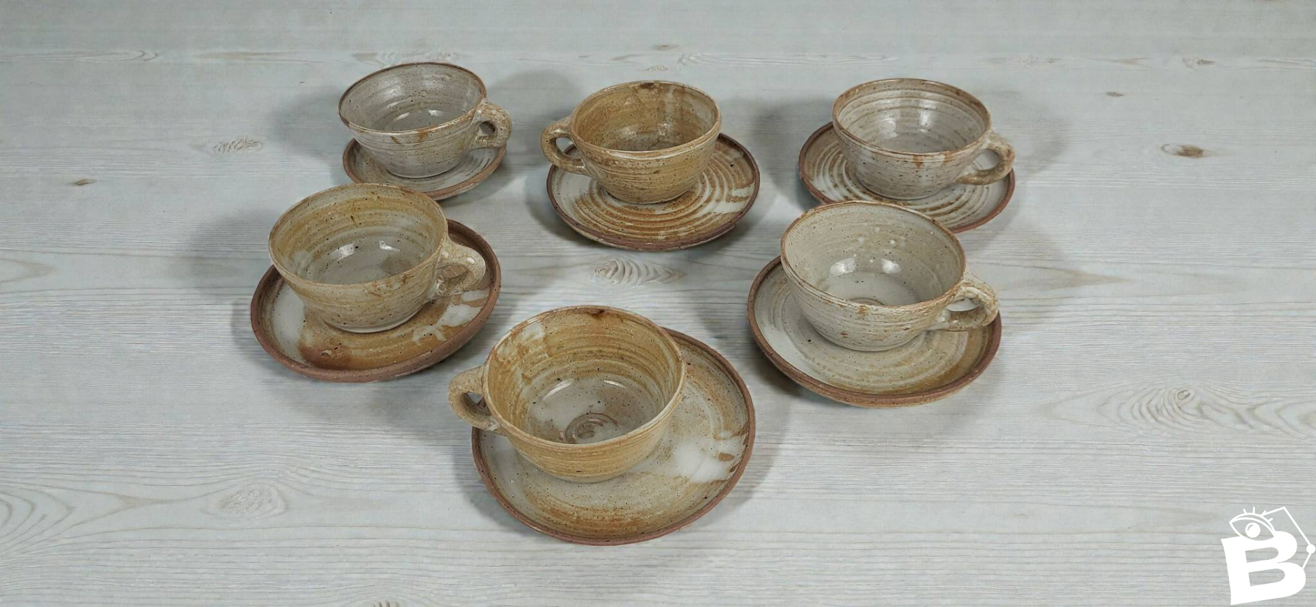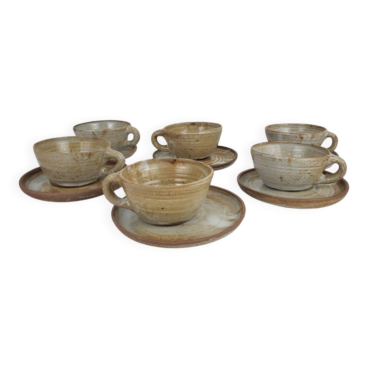 6 tasses / sous tasses en grès pierre lion.Hauteur 5 cm.Diamètre au buvant 9, 2 cm.En bon état / traces minimes d'usage et d 'ancienneté.Une soucoupe est plus petite que les autresEmballage soigné et livraison rapide.