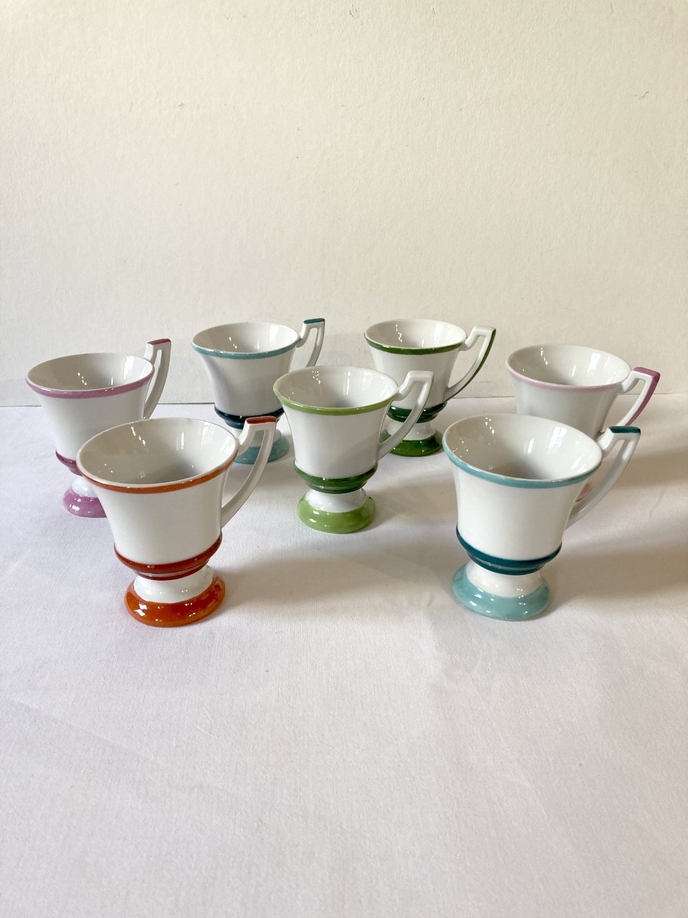 Ensemble de sept tasses à café en faïence façonnées à la main, de type brulots de bistrot.