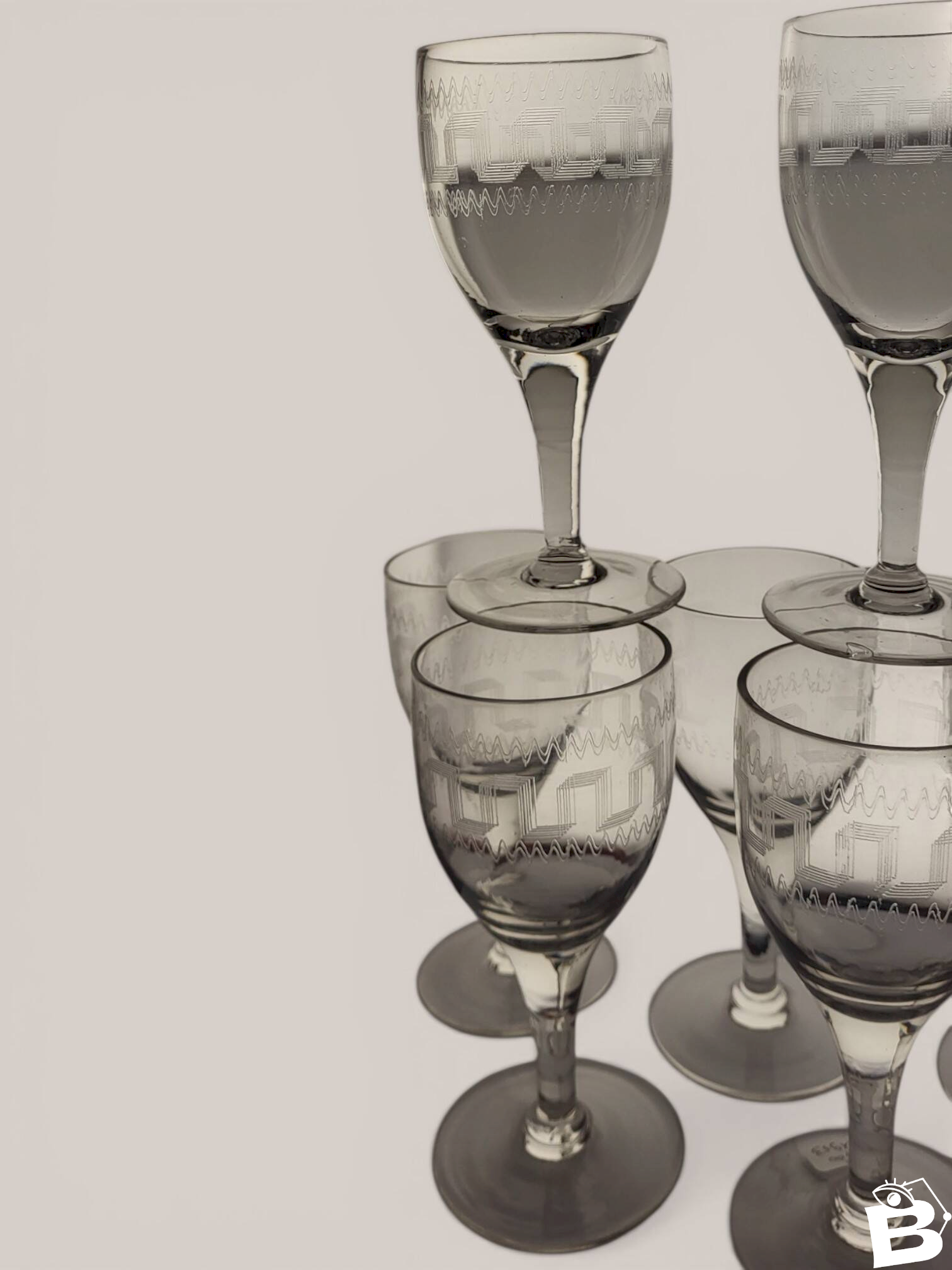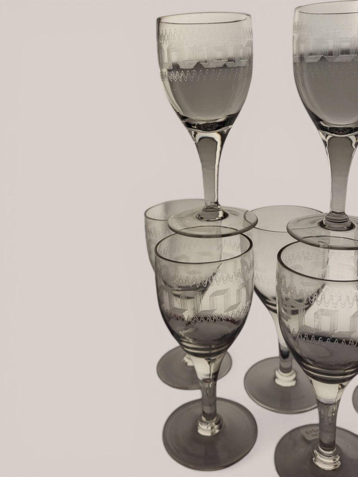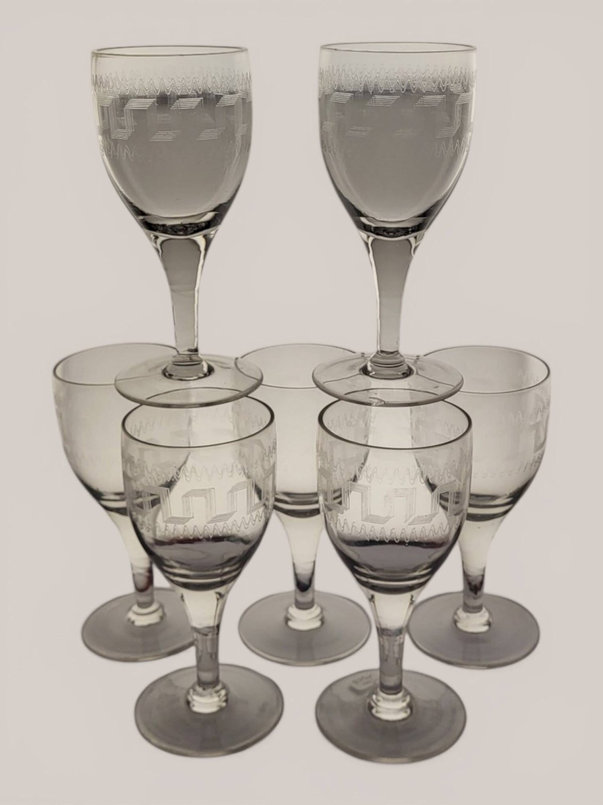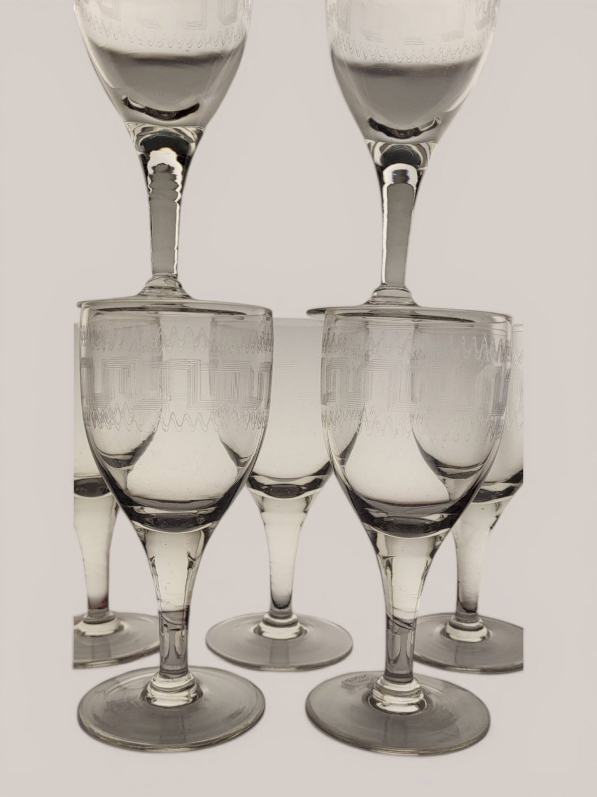 7 verres à vin décor à la grecque / verre. Hauteur 16, 5 cm. Diamètre au bu Transparent