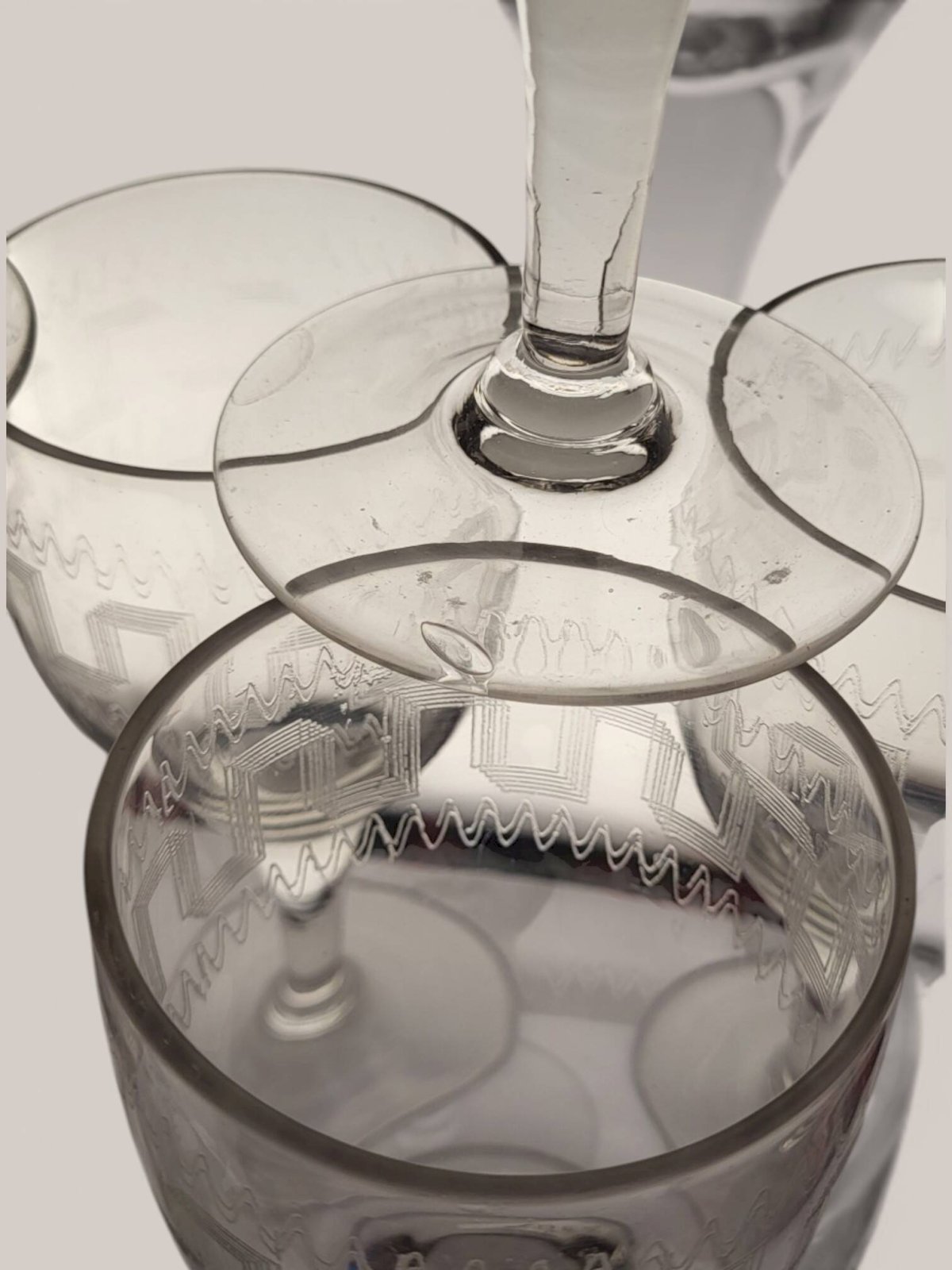 9 VERRES A PIEDS en VERRE décor taillés dont frise ETOILES Bord buvant table XXe