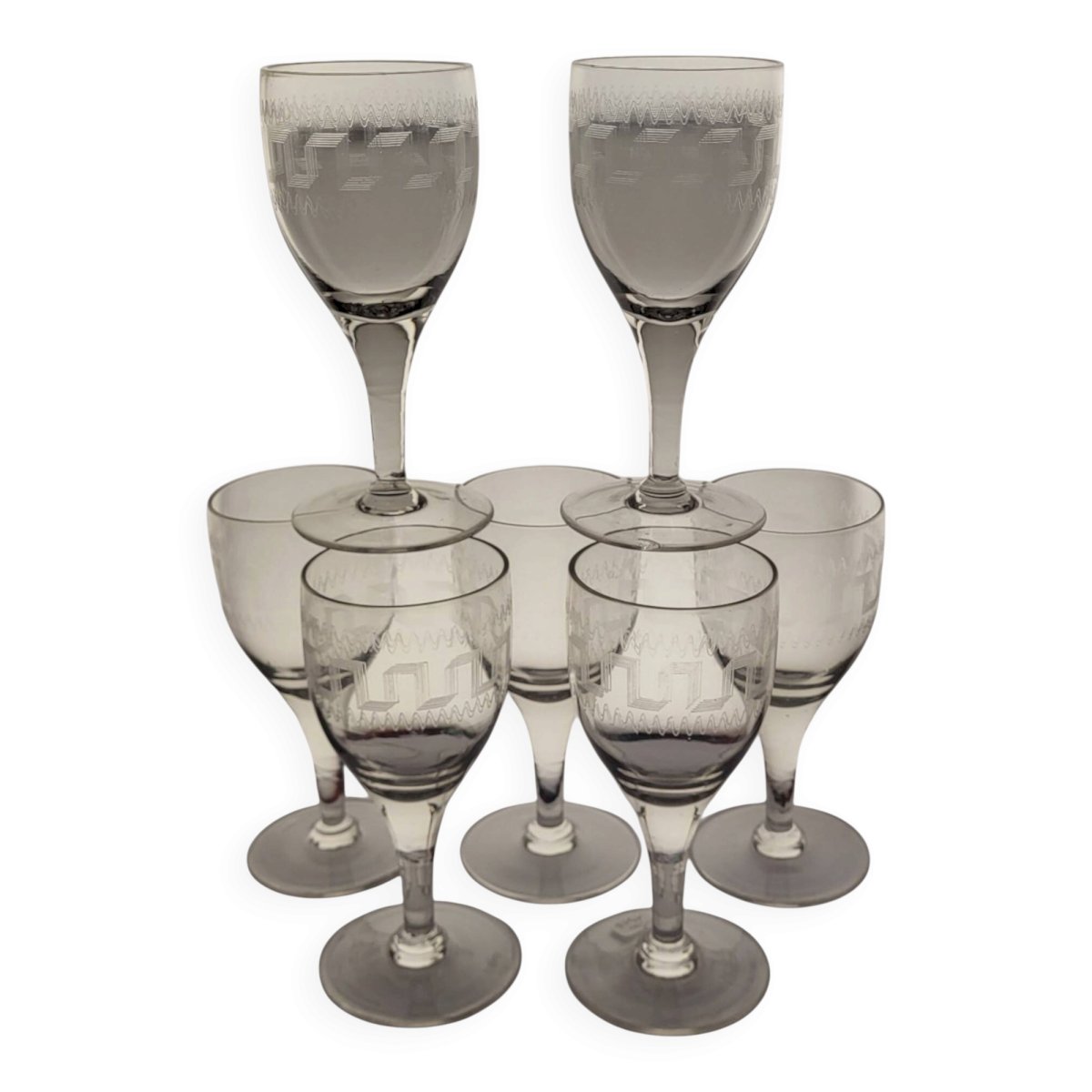 7 verres à vin décor à la grecque / verre.Hauteur 16, 5 cm.Diamètre au buvant 7 cm.Contenance 22 cl.Ils sont tous en bon état avec traces d'usage et d'ancienneté (non blanchis et sans éclat).Emballage soigné et livraison rapide.