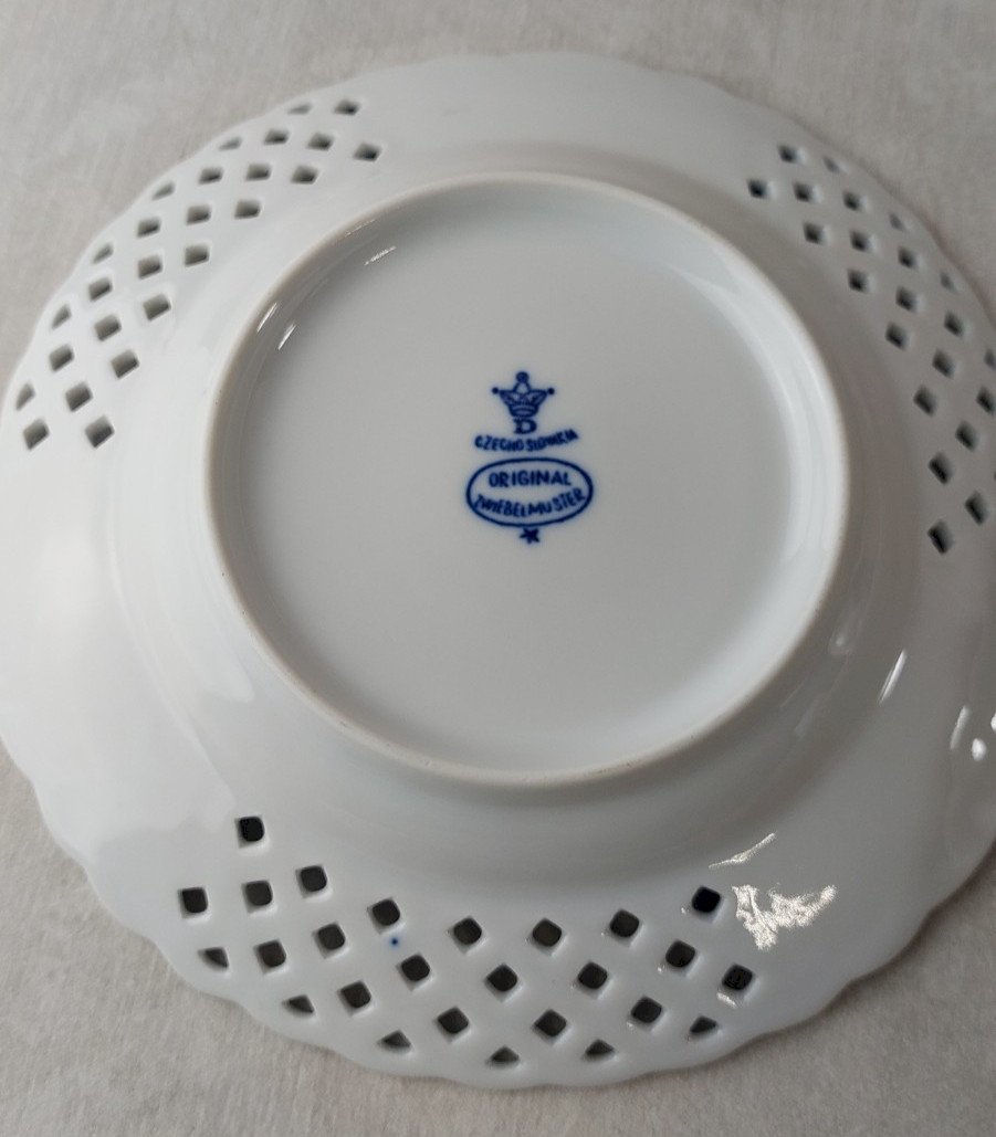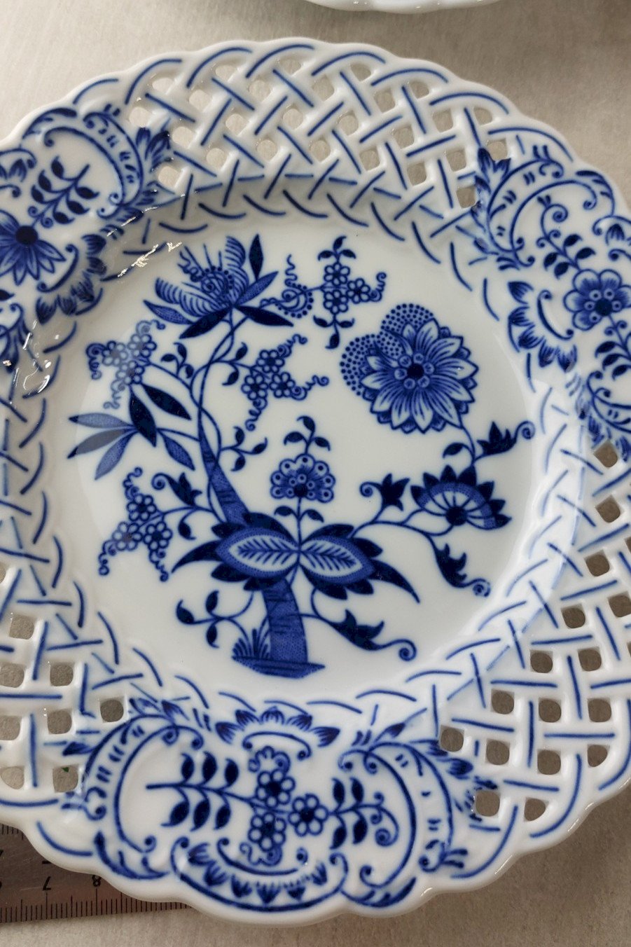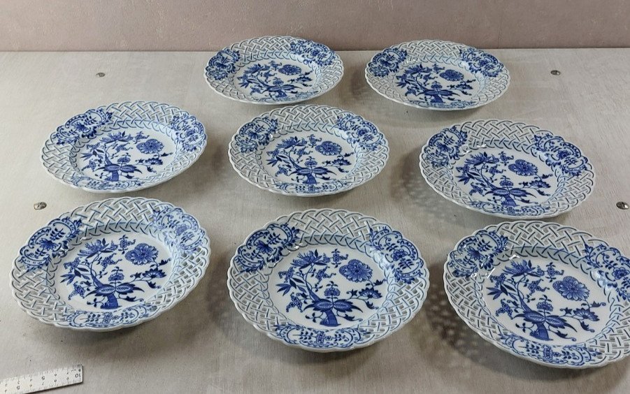 Lot de 8 anciennes assiettes à dessert ajourées / présentation, décor Blue Onion / fleurs d'oignon / Zwiebelmuster, en porcelaine de Tchécoslovaquie / Czech, style Meissen en très bon état, pas de fêle ni d'éclat diamètre 19 cm v oir photos  Consultez mes autres objets  !  réduction des frais de port en cas d'achat groupé