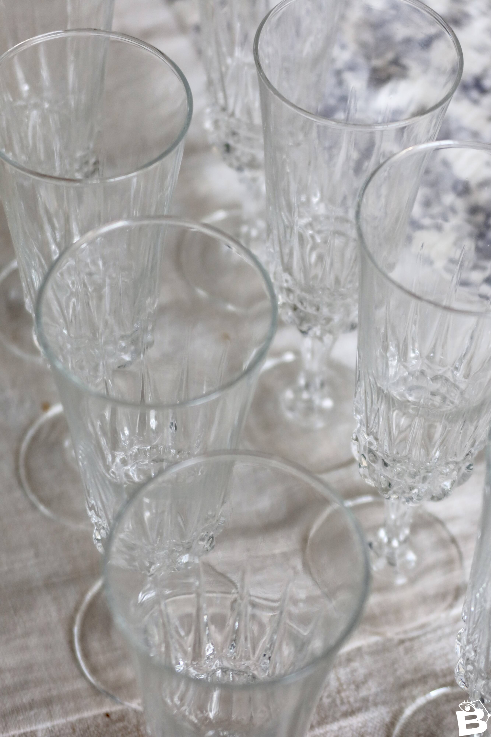 Beau lot de huit coupes à champagne en verre vintage, au design travaillé et élégant.