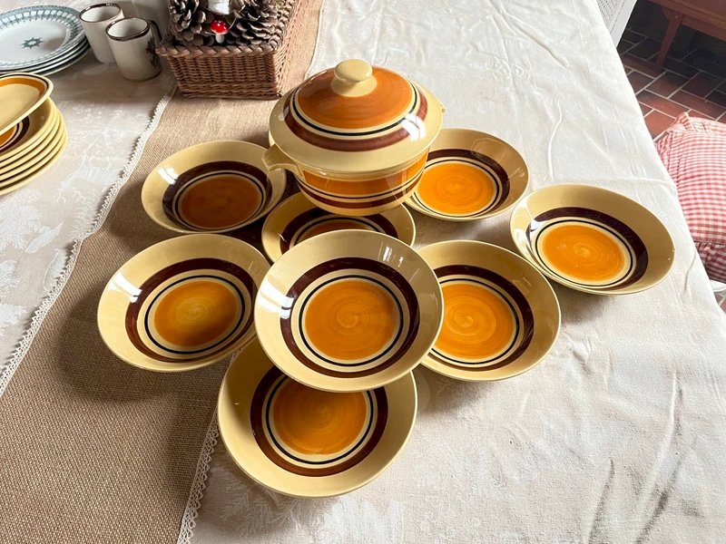 9 assiettes creuses « calottes » modèle Gallia Faïencerie de Gien datant de 1960 Soupière (un petit poc à l’intérieur du couvercle) Belle brillance, très bon état Assiettes diamètre 20cm, hauteur 4cm Soupière diamètre 20,5cm, hauteur sans couvercle 10cm, avec couvercle 17cm (6 assiettes plates et petit plat en vente séparément)