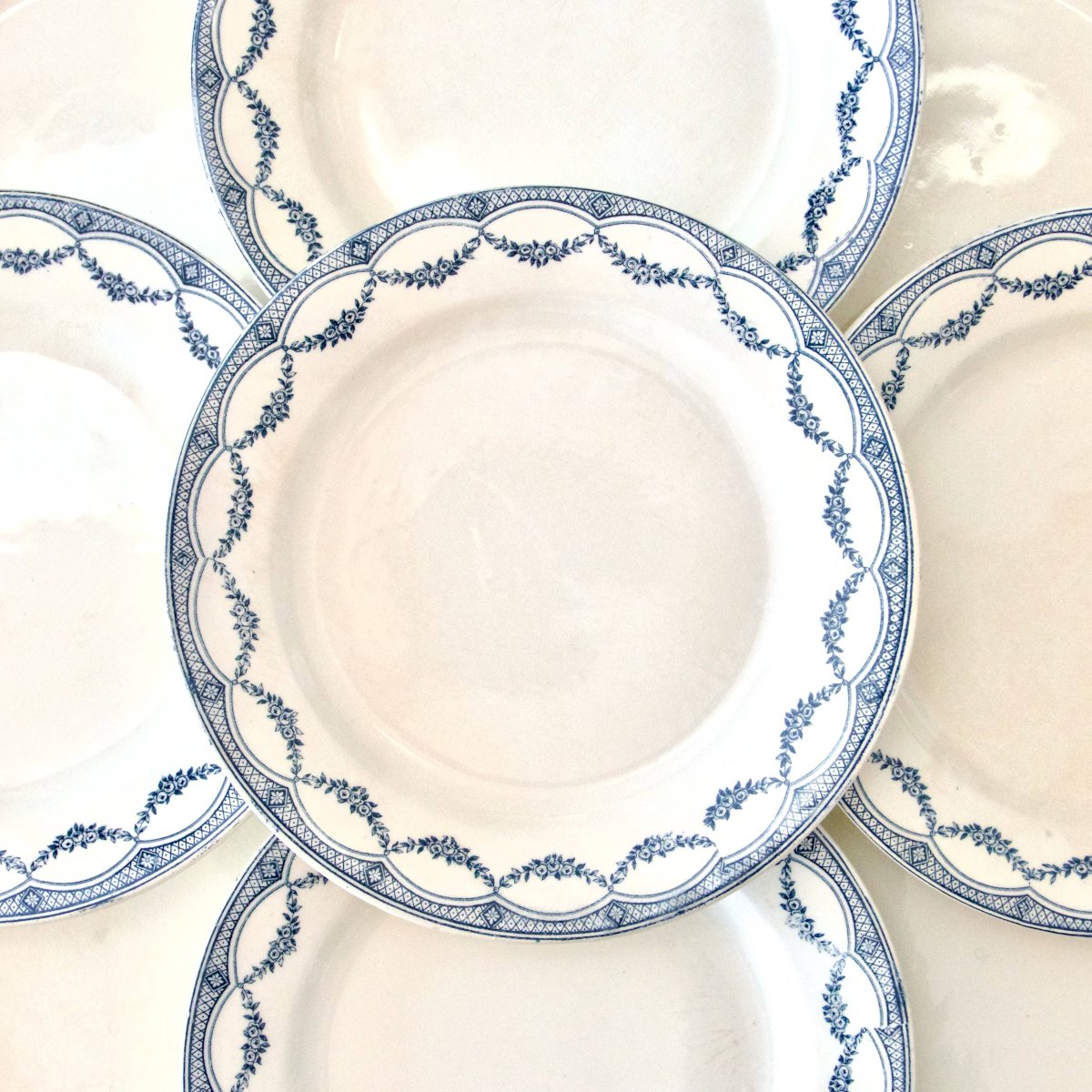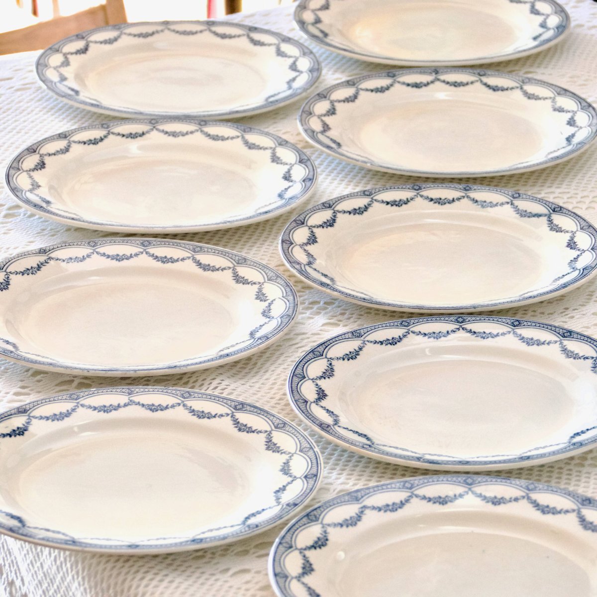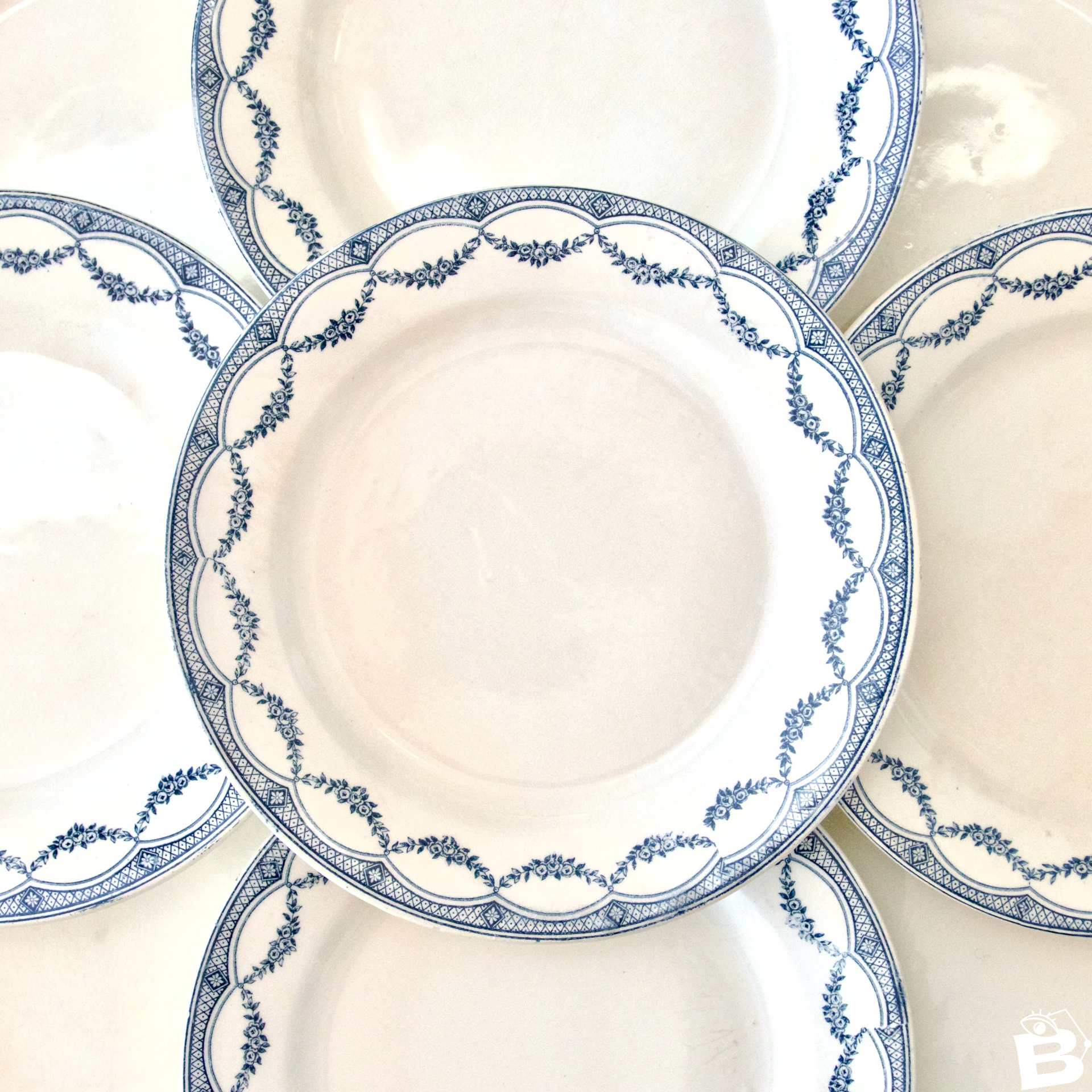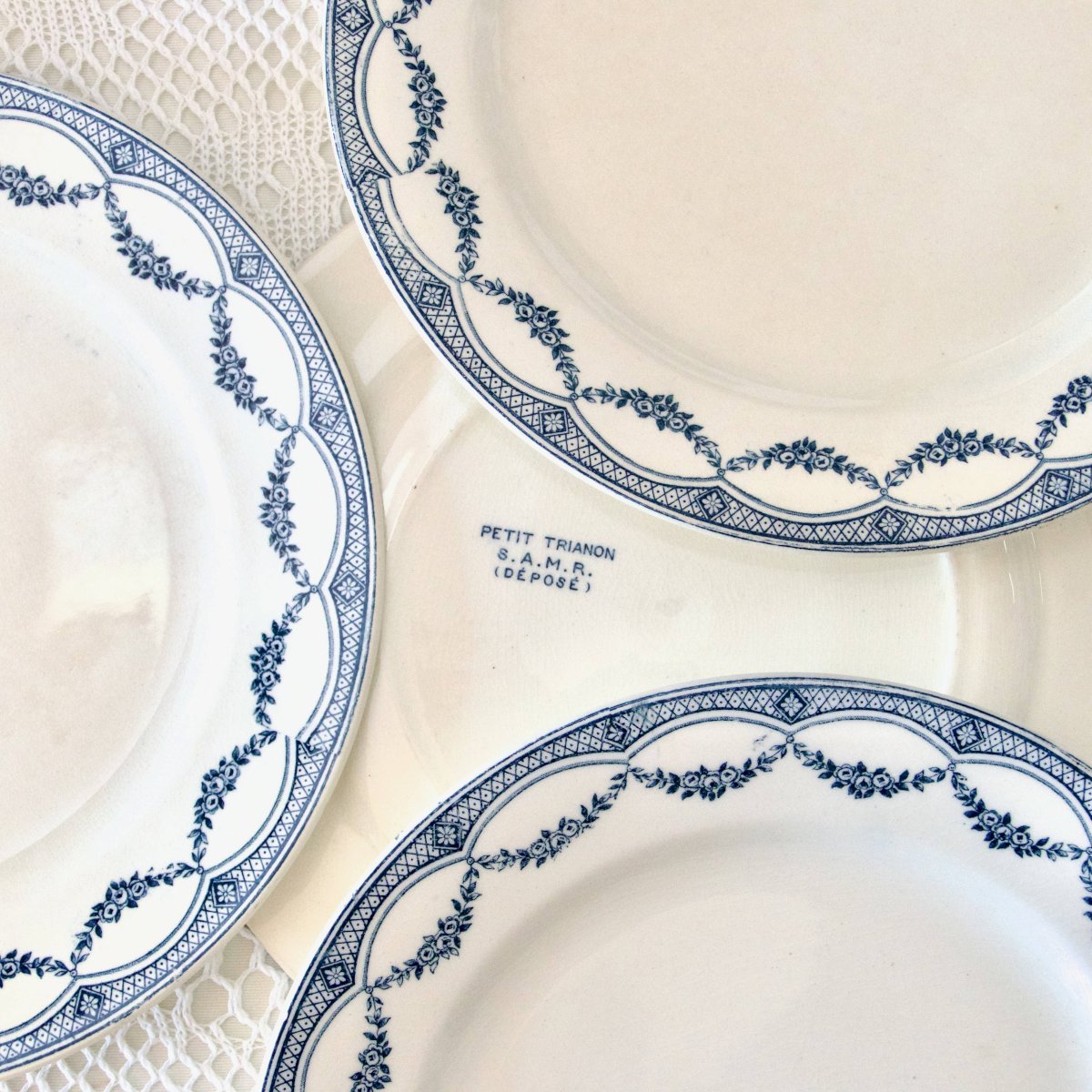 Ensemble de 9 très jolies et grandes assiettes plates anciennes, terre de fer, estampillées Salins (S.A.M.R) collection “Petit Trianon”.Joli décor végétal en guirlandes fleuries de délicates roses.Elles sont en très bel état, pas de fêle, quelques traces du temps et légère patine.2 assiettes ont une petite égrenure sur le bord, voir dernière photo.? 24, 5 cm.✨ Envoi très soigné.✨ Nous avons d'autres annonces en ligne, n'hésitez pas à jeter un coup d'oeil ! 3, 3 kg.02/25.