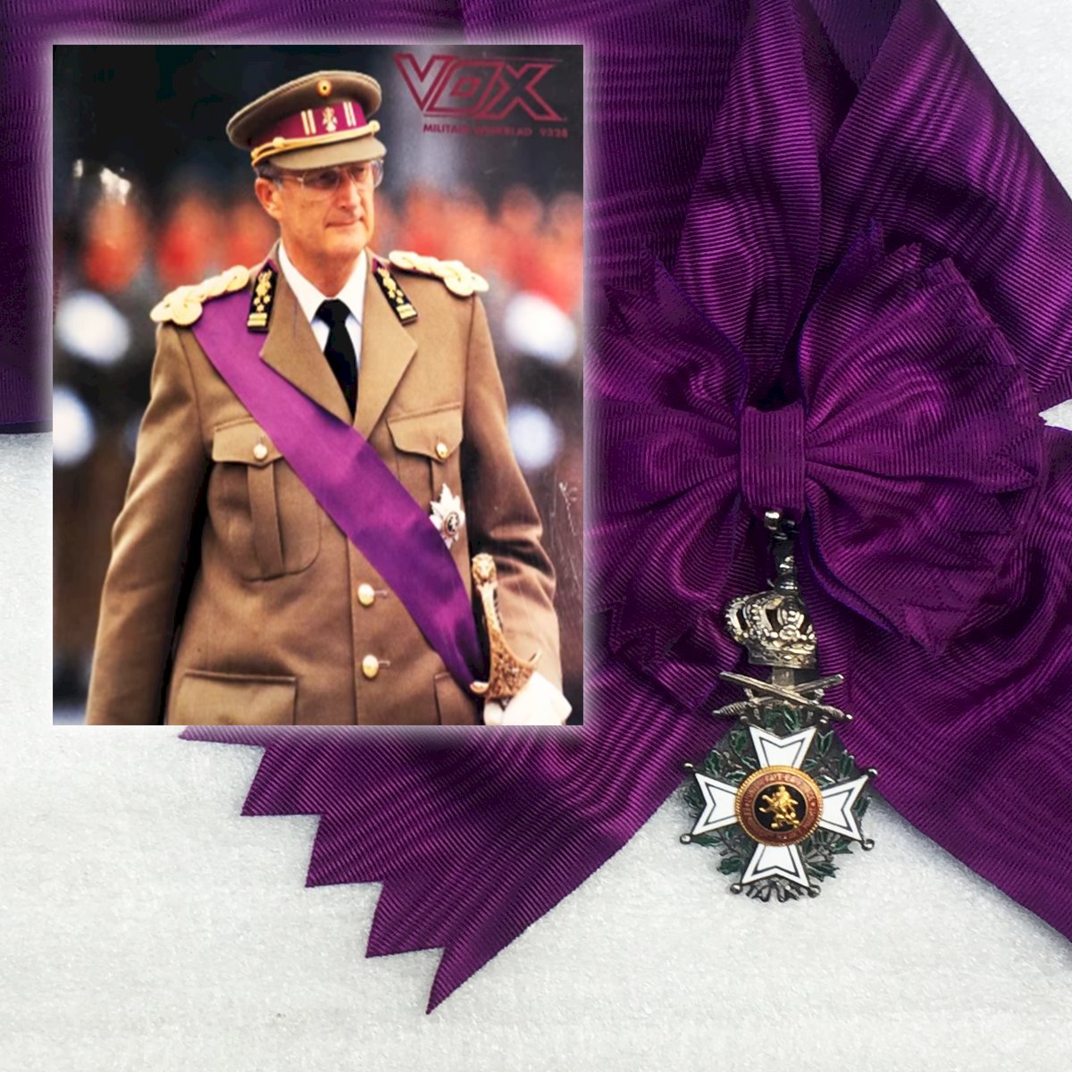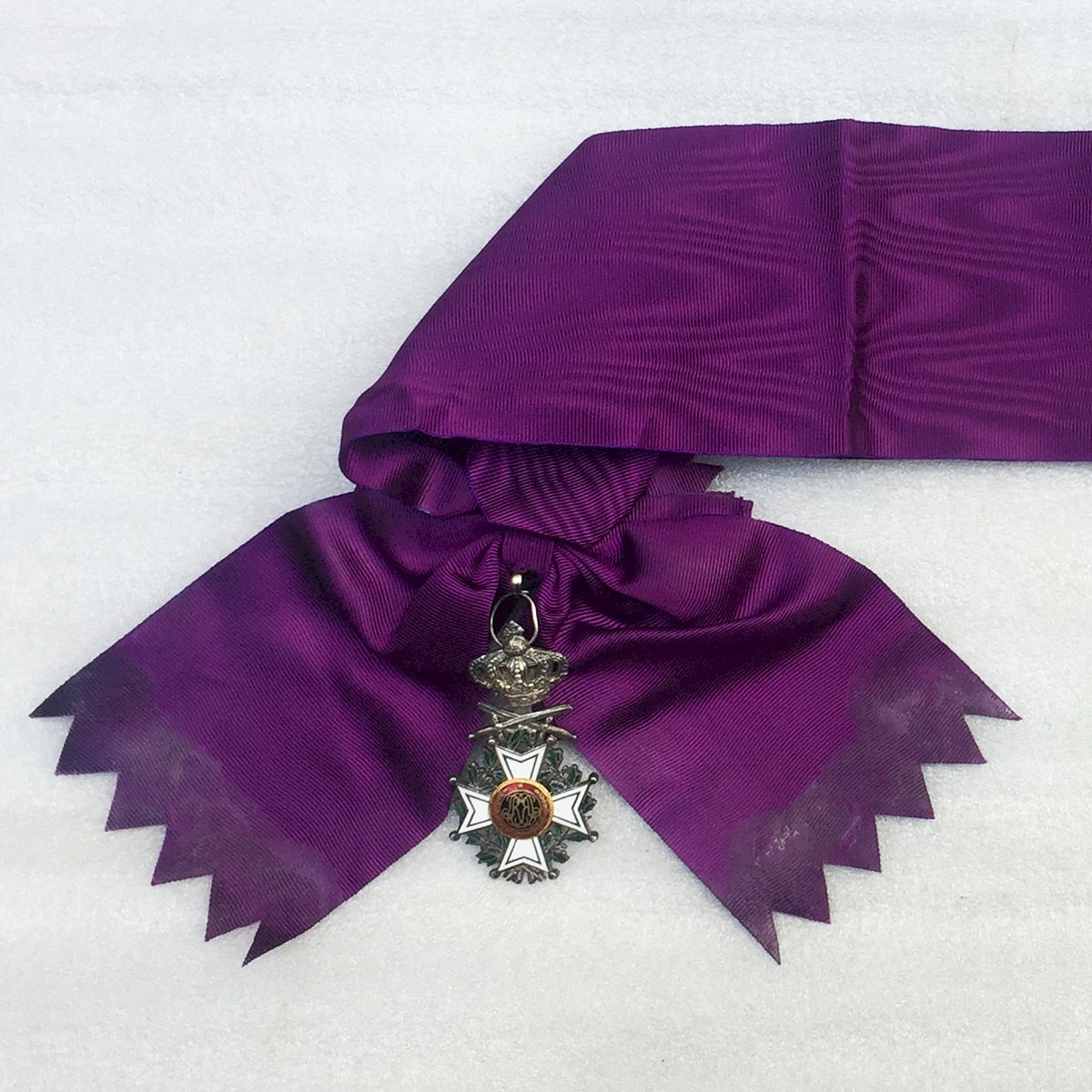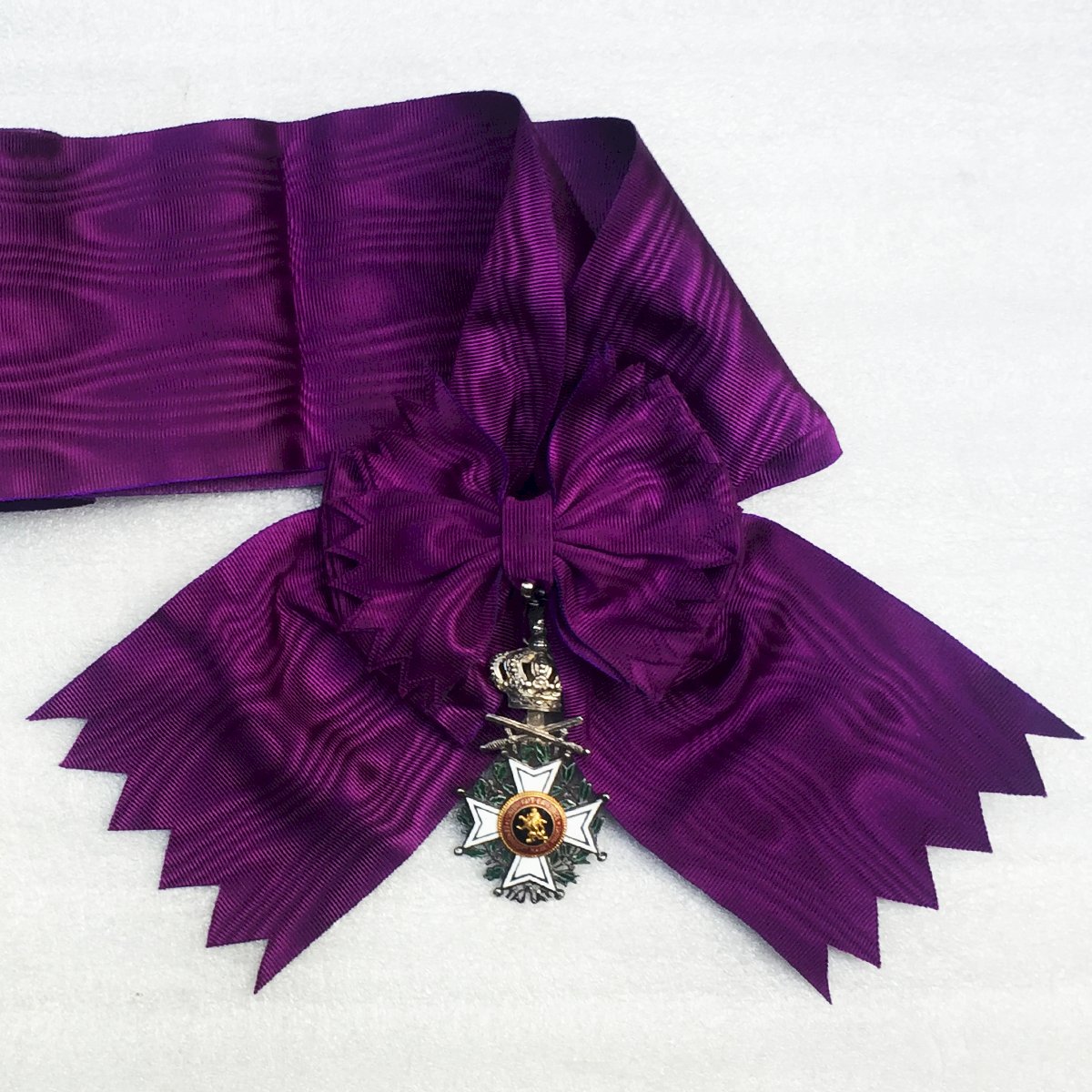Très beau bijou, grand cordon, bilingue de l'ordre de Leopold 1er officier avec glaives pour officier supérieur. Croix émaillée en bronze doré avec émailles à chaud d'origine avec ses glaives (pour mérite militaire). Fabrication deuxième partie du XX, double devise (française et flamande). Patine et traces dûes au temps. Très agréable à tenir en mains et encore plus à observer en vitrine. Très rare et 100% original.