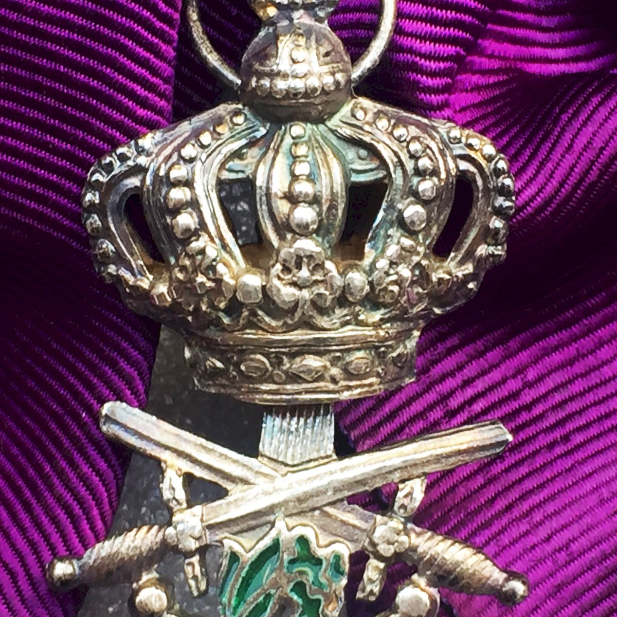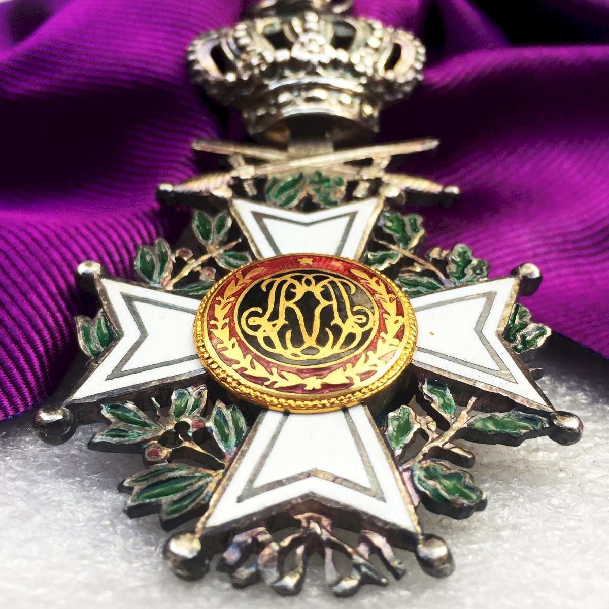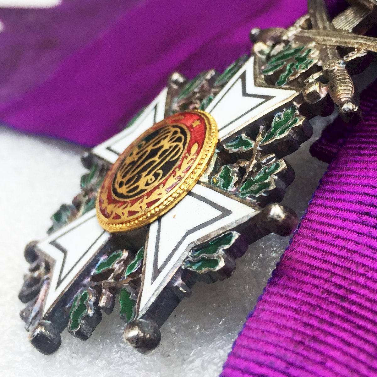 Très beau bijou, grand cordon, bilingue de l'ordre de Leopold 1er officier avec glaives pour officier supérieur. Croix émaillée en bronze doré avec émailles à chaud d'origine avec ses glaives (pour mérite militaire). Fabrication deuxième partie du XX, double devise (française et flamande). Patine et traces dûes au temps. Très agréable à tenir en mains et encore plus à observer en vitrine. Très rare et 100% original.