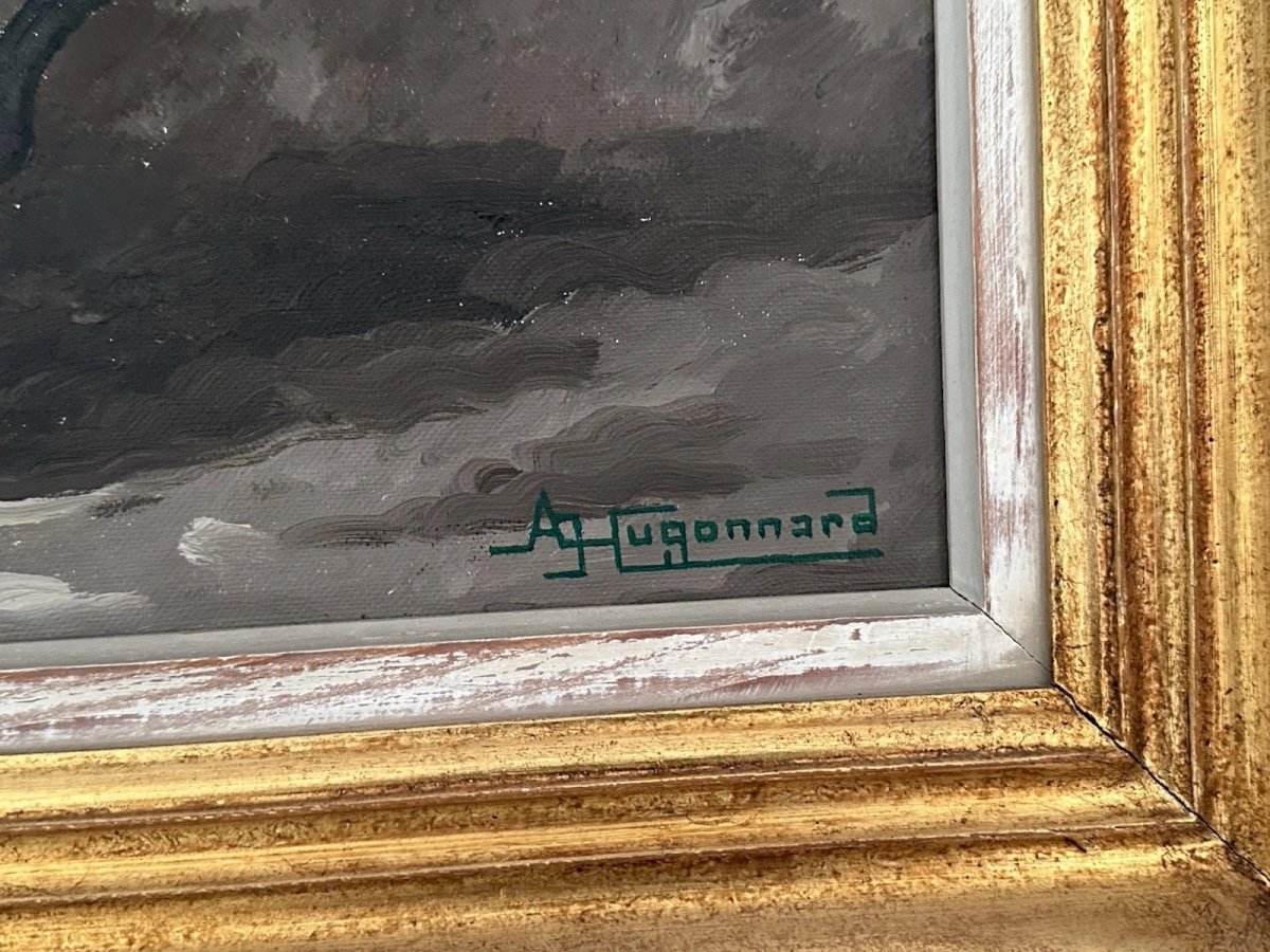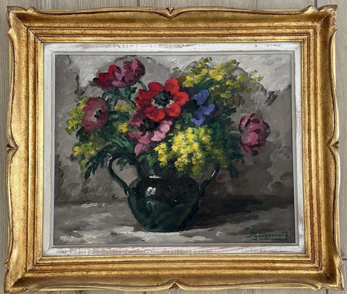 Adeline Hugonnard : HST Bouquet de fleurs Dimensions avec cadre : 54x46 cm Dimensions de la peinture : 41 x 33 cm Adeline Hugonnard est une artiste peintre Française née à Saint-Etienne (Loire) en 1906, et décédée à Chauffailles (Saône-et-Loire) en 1987. Biographie Considérée comme une artiste régionale, Adeline Hugonnard a consacré une grande partie de ses œuvres à des motifs floraux. Elève de l'école des Beaux-Arts de Saint-Etienne, elle expose à 19 ans, en 1925, cinq toiles au salon de la Société des Arts du Forez (chrysanthèmes, dahlias, giroflées, roses et reines-marguerites). Parmi les œuvres du salon, on trouve aussi des tableaux d'Antoine Barbier, maître lyonnais de l'aquarelle. En 1926, la ville de Saint-Etienne achète une nature morte, fleurs et fruits. Ce sera la première œuvre d'une longue série acquise par les stéphanois (collections institutionnelles et particulières). Elle ne cessera plus de peindre et expose régulièrement dans les salons régionaux : Saint-Etienne, Lyon (Salon d’Automne), Roanne. Elle a peint certaines toiles ovales jusqu'aux années trente. Ses aquarelles sont plus rares. Dès sa naissance en 1906, on diagnostiquera une malformation du larynx qui la rendra sourde et muette. Ce handicap a sans aucun doute gêné sa carrière artistique et sa cote d'artiste. Au décès de son père en 1940, elle vivra seule avec sa mère. Elle entrera à la maison de retraite de Chauffailles après le décès de celle-ci et la direction lui aménage un coin-atelier. Adeline continuera de peindre des fleurs, sur de nombreux supports (doublure de son manteau, serpillières, etc.). A sa mort sans postérité, elle fera don de son fonds d'atelier à la ville de Chauffailles. Deux de ses œuvres sont conservées au Musée d'Art Moderne et Contemporain de Saint-Étienne Métropole, une autre au Centre National des Arts Plastiques (CNAP), d'autres encore au Musée de la Ville de Chauffailles, situé au Château de Chauffailles (Saône-et-Loire), au coté des oeuvres de Marcel Journay. Une exposition organisée par la galerie "La Bartavelle" a eut lieu en 2010 à Charlieu (Loire) : "Adeline Hugonnard, peintre de fleurs", ainsi qu'en 2014 à Usson-En-Forez: "Adeline Hugonnard, une vie de peinture". Type:Huile Caractéristiques:Signé Thème:Fleur, Arbre Pays d'origine:France