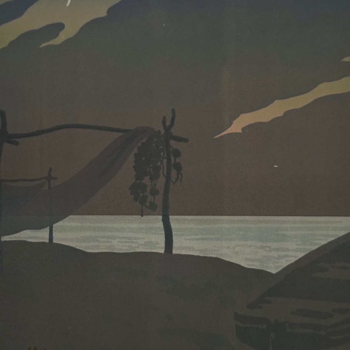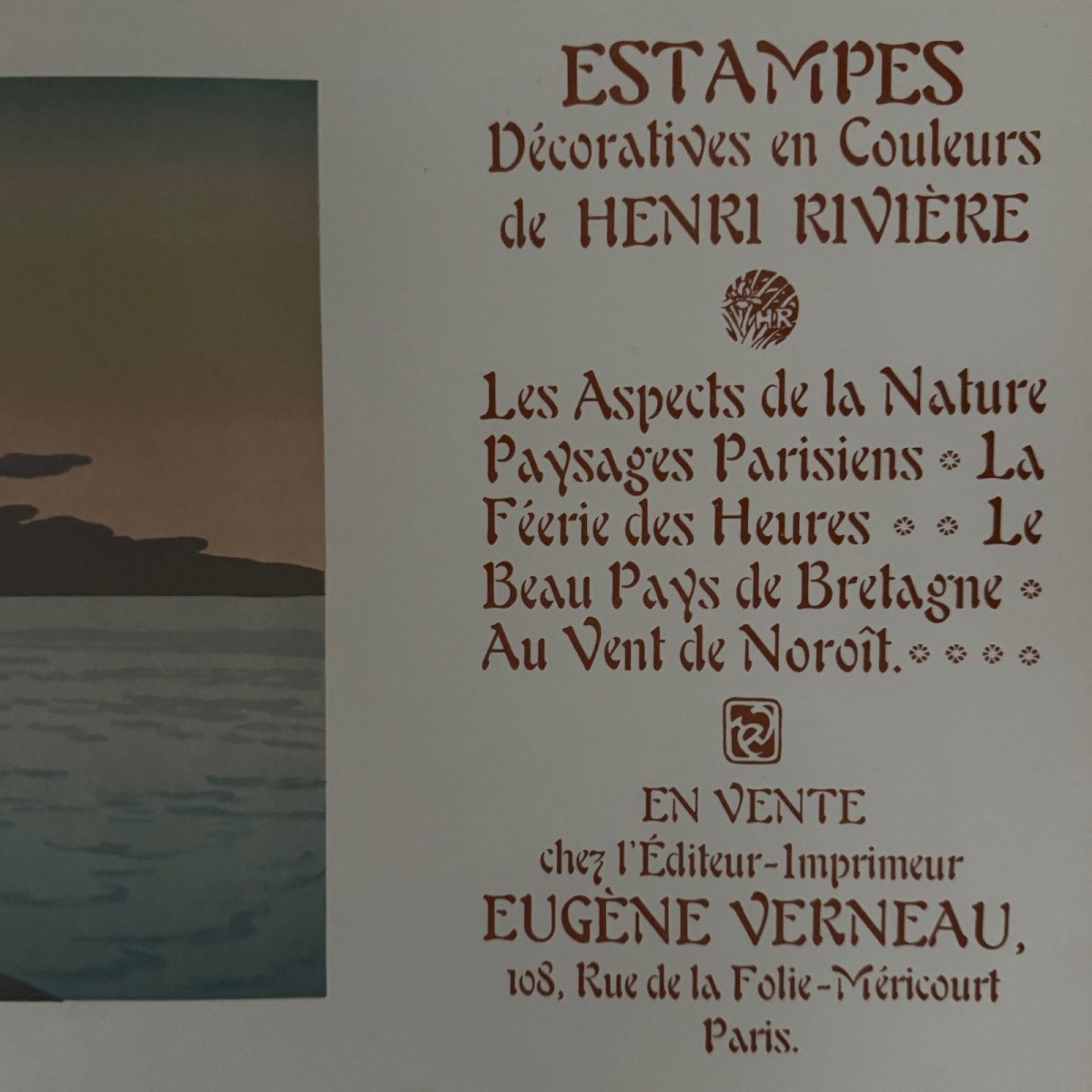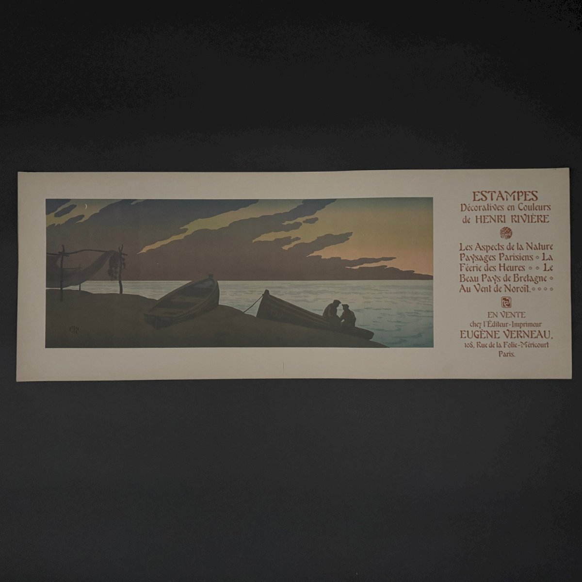 Affiche promotionnelle lithographie par Henri Rivière - Le Soir A5660 Cette lithographie promotionnelle “La Féérie des Heures - Le soir” porte un cachet au timbre rouge en bas à gauche. L’œuvre est authentique et ancienne. Pour l’état, notons dans la marge des petites traces de pliage et traits d'encre. Sur la litho, nous signalons des petites taches par endroits. La lithographie est très fraiche en couleur, une fois encadrée la plupart des défauts seront peu visibles. Vendue telle que présentée. Henri Rivière (1864-1951) est un artiste peintre, graveur et illustrateur français. Il commence sa carrière par le dessin puis par la gravure en taille douce et spécifiquement l’eau-forte en 1882. Parallèlement il entame une carrière de metteur en scène et scénographe, en 1886, du théâtre d’ombres au cabaret du Chat noir, spectacles qu’il améliore par la création de décors en couleurs, très novateurs. Il se consacre ensuite exclusivement à la peinture et à la gravure et s’impose dans l’histoire de l’eau-forte, de l’estampe, de la gravure sur bois, de la lithographie et de l’aquarelle (il a peint environ un millier d’aquarelles). Nos nombreuses photos vous permettent d’apprécier la qualité de cette lithographie. Merci de bien détailler les photos. N’hésitez pas à zoomer. Les photos font partie intégrante de la description. Dimensions : Hauteur : 32,5 cm Largeur : 85 cm Œuvre Hauteur : 23,8 cm Largeur : 60 cm S : S7F2Y3D7 A : BKKYGYIYCN P : 1611738 Je reste à votre disposition pour toute question. Authenticité:Inconnu Type:Lithographie Support:Sur papier Hauteur:32,5 cm Caractéristiques:Signée Thème:Paysage Largeur:85 cm