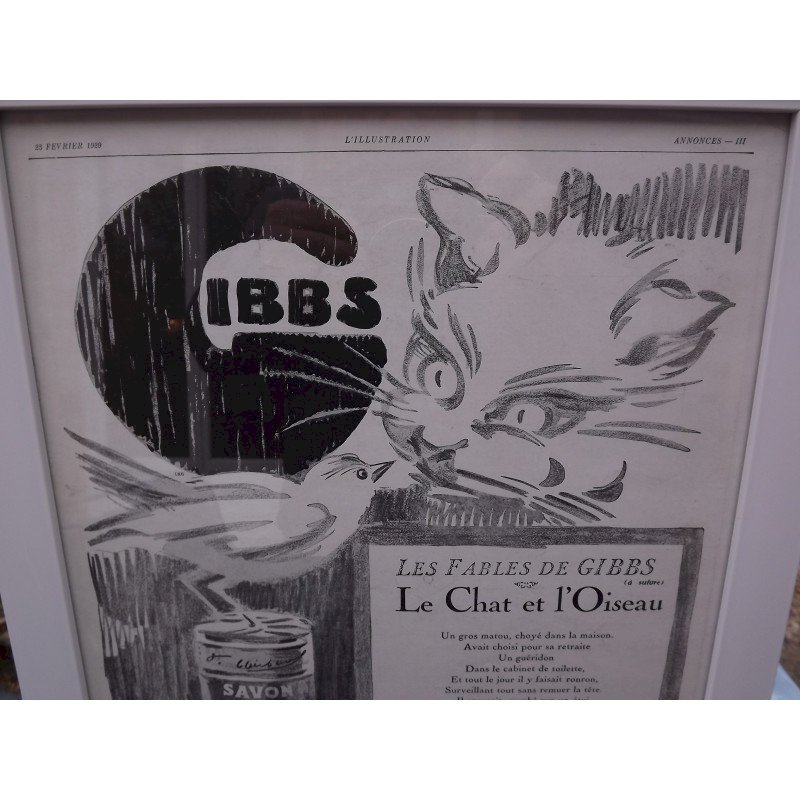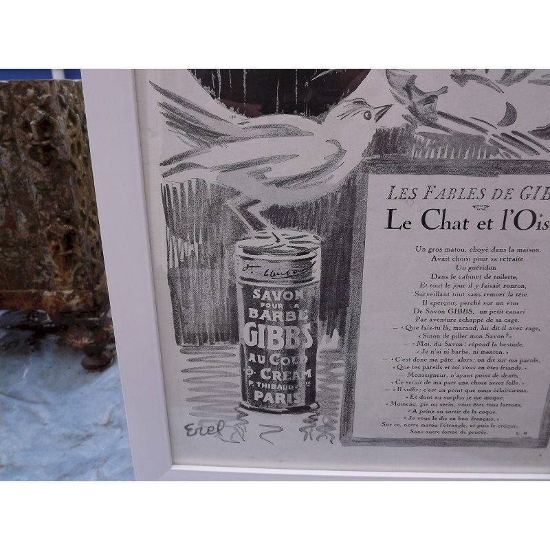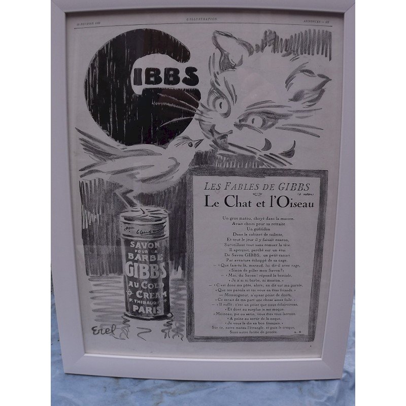 Affiche Pub GIBBS 1929 par EREL , dimensions cadre sous verre : 40 cm sur 30 cm  , trés bon ètat , d'autres photos sur votre messagerie , visible à GARDONNE (24) envoi en mondial relay de : 6 € ou colissimo : 8,50 € ,