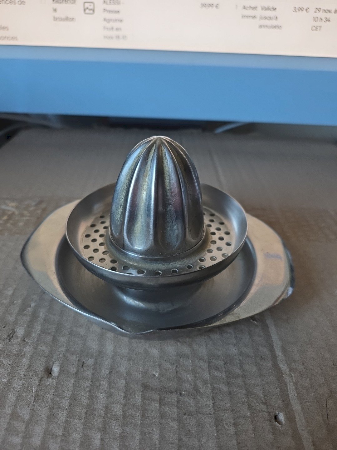bel etat , design Alessi État:Occasion: Objet ayant été utilisé. Objet présentant quelques marques d'usure superficielle, ...Occasion: Objet ayant été utilisé. Objet présentant quelques marques d'usure superficielle, entièrement opérationnel et fonctionnant correctement. Il peut s'agir d'un modèle de démonstration ou d'un objet retourné en magasin après une courte période d'utilisation. les éventuelles imperfections. Couleur:Argenté Marque:ALESSI design Type:Presse agrume Matériau:Inox