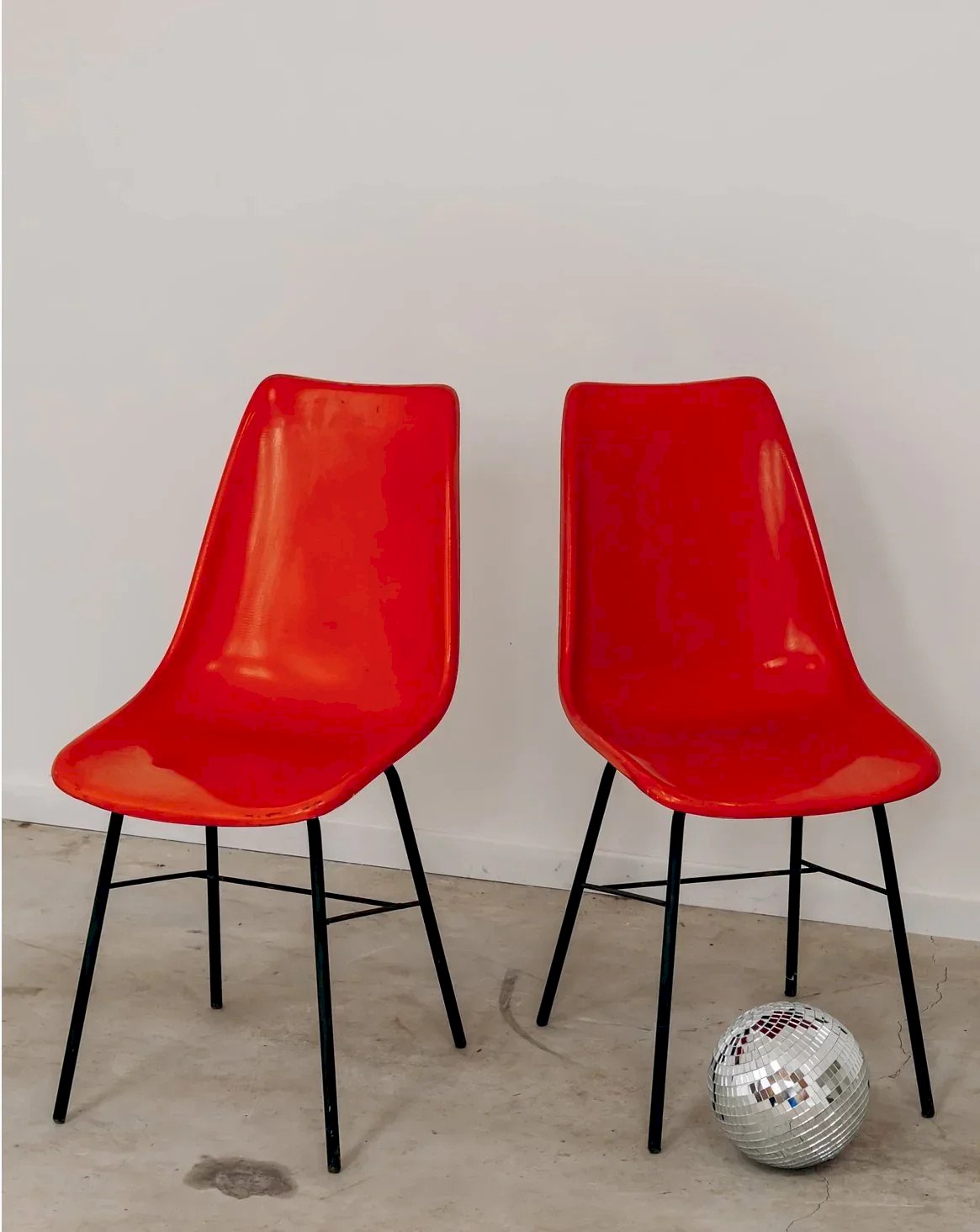 Coup de cœur pour cette chaise signée Miroslav Navràtil et fabriquée à la fin des années 50. Elle est composée d'un piètement métallique noir sur lequel vient reposer une coque en fibre de verre. Ces chaises sont estampillées au dessous. Nous aimons la finesse de ses lignes et sa couleur rouge audacieuse. L'assise parfaite pour aménager une chambre ou un salon avec style. Chaises vendues à l'unité, 4 exemplaires sont disponibles. Largeur : 42 cm Hauteur : 88 cm Hauteur d'assise : 43 cm Profondeur : 45 cm État:Occasion: Objet ayant été utilisé. Objet présentant quelques marques d'usure superficielle, ...Occasion: Objet ayant été utilisé. Objet présentant quelques marques d'usure superficielle, entièrement opérationnel et fonctionnant correctement. Il peut s'agir d'un modèle de démonstration ou d'un objet retourné en magasin après une courte période d'utilisation. les éventuelles imperfections. Couleur:Multicouleur Hauteur:Métal, Fibre de verre Largeur:Chaises Marque:Debongout Type:Produit chiné Matériau:Métal, Fibre de verre Style:Contemporain
