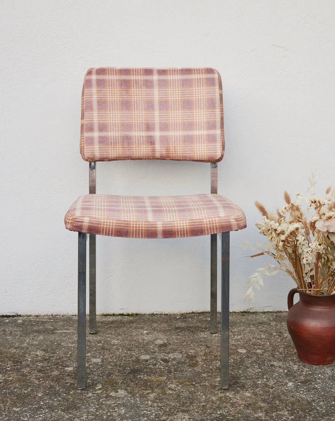 Découvrez cette chaise des années 70 recouverte d’un velours écossais neuf, rénové à la main pour obtenir un délicat effet ancien. Son piètement chromé apporte une touche graphique et légère, révélant l’alliance du métal et du tissu. L'assise au toucher doux et les proportions équilibrées invitent à s'installer pour un coin lecture, une salle à manger intime ou comme pièce d'appoint. Elle insuffle une atmosphère chaleureuse et raffinée, parfaite pour un intérieur vintage contemporain. Longueur : 55 cm Largeur : 55 cm Hauteur : 82 cm Hauteur d'assise : 46 cm Profondeur de l'assise : 55 cm Largeur de l'assise : 55 cm État:Occasion: Objet ayant été utilisé. Objet présentant quelques marques d'usure superficielle, ...Occasion: Objet ayant été utilisé. Objet présentant quelques marques d'usure superficielle, entièrement opérationnel et fonctionnant correctement. Il peut s'agir d'un modèle de démonstration ou d'un objet retourné en magasin après une courte période d'utilisation. les éventuelles imperfections. Couleur:Multicouleur Hauteur:Chrome Largeur:Chaises Marque:Debongout Type:Produit chiné Matériau:Chrome Style:Contemporain