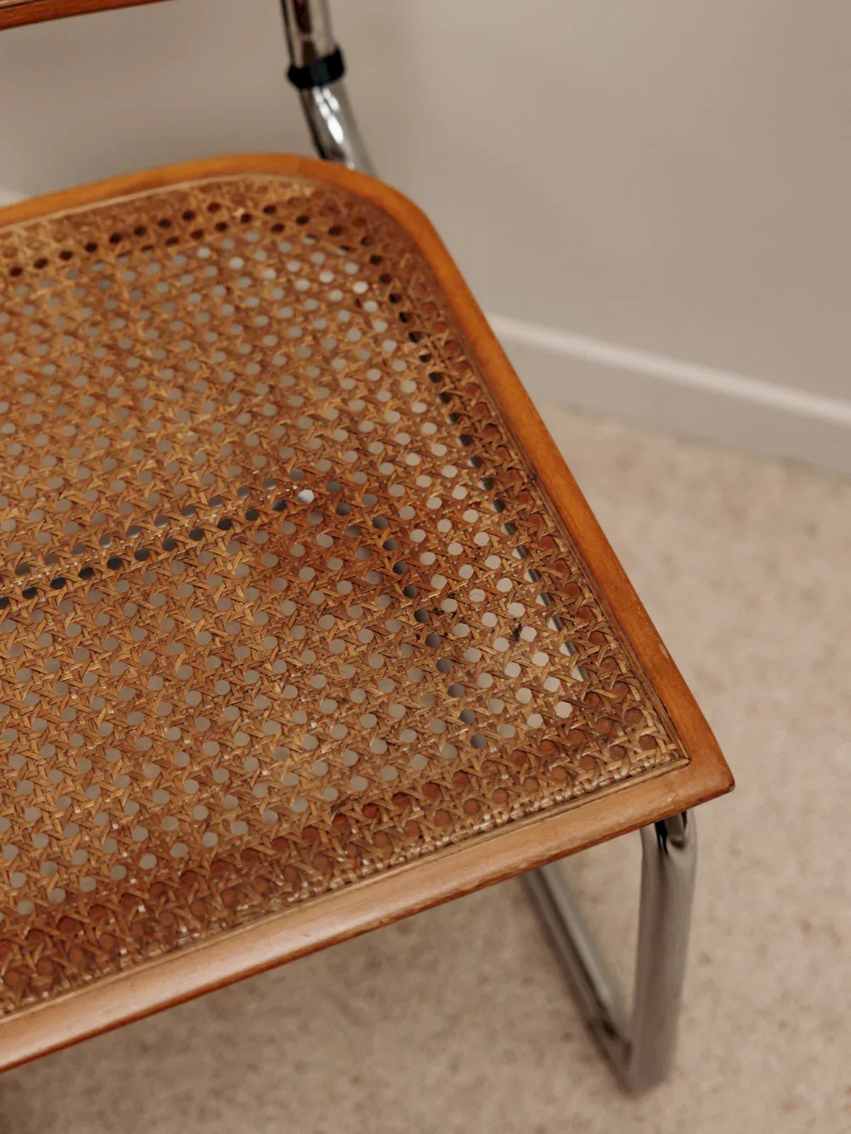 Découvrez la chaise B32, une œuvre emblématique du designer Marcel Breuer, véritable symbole du mouvement Bauhaus. Sa structure tubulaire en métal chromé assure une robustesse tout en apportant une touche de modernité, tandis que l'assise et le dossier en hêtre et cannage offrent un confort inégalé. Avec son esthétique vintage, cette chaise s'intègre harmonieusement dans tout intérieur contemporain ou classique. Apportez une note de design intemporel à votre espace avec ce modèle incontournable. Longueur : 46 cm Largeur : 47 cm Hauteur : 83 cm Hauteur d'assise : 46 cm Profondeur de l'assise : 46,5 cm Largeur de l'assise : 43 cm État:Occasion: Objet ayant été utilisé. Objet présentant quelques marques d'usure superficielle, ...Occasion: Objet ayant été utilisé. Objet présentant quelques marques d'usure superficielle, entièrement opérationnel et fonctionnant correctement. Il peut s'agir d'un modèle de démonstration ou d'un objet retourné en magasin après une courte période d'utilisation. les éventuelles imperfections. Couleur:Multicouleur Hauteur:Bois, Chrome Largeur:Chaises Marque:Debongout Type:Produit chiné Matériau:Bois, Chrome Style:Contemporain