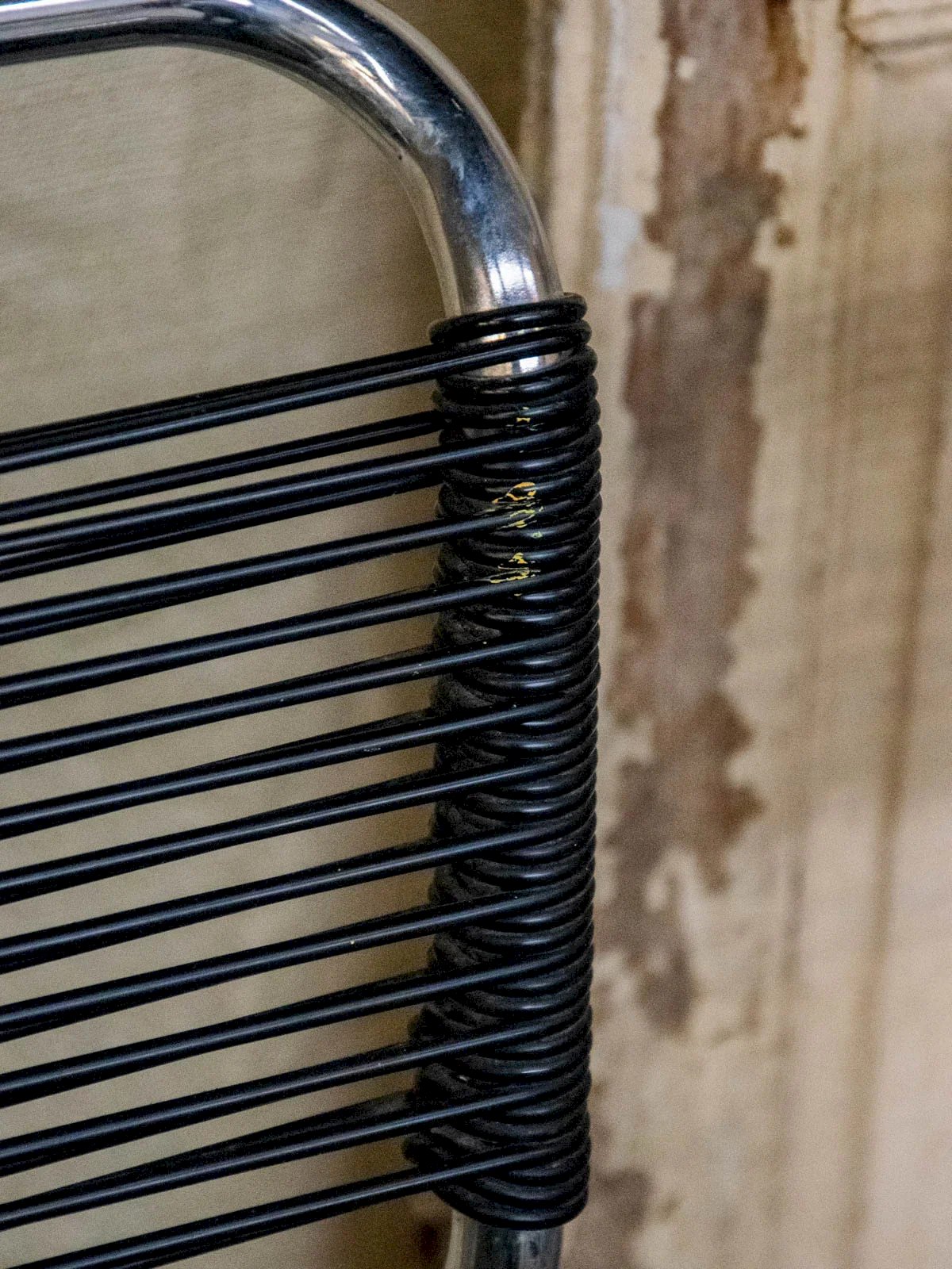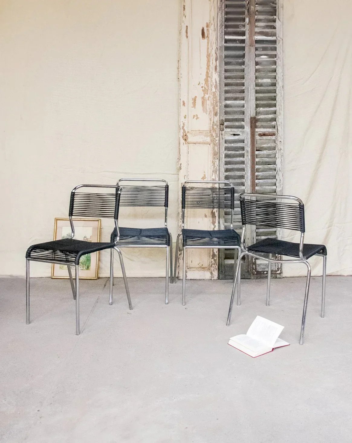 Invitez ces quatre chaises au design rétro en métal chromé, assise et dossier en scoubidou noir tressés et croisés pour un effet graphique et chaleureux. Le dossier recourbé élance la silhouette et assure un maintien agréable, parfait autour d'une table, dans un coin repas ou pour ponctuer un bureau contemporain. Le contraste du chrome et de la matière synthétique crée une ambiance vintage, conviviale et raffinée. Légères traces du temps présentes. Longueur : 51 cm Largeur : 53 cm Hauteur : 84 cm Hauteur d'assise : 48 cm Profondeur de l'assise : 39 cm Largeur de l'assise : 41 cm Hauteur du dossier : 34 cm État:Occasion: Objet ayant été utilisé. Objet présentant quelques marques d'usure superficielle, ...Occasion: Objet ayant été utilisé. Objet présentant quelques marques d'usure superficielle, entièrement opérationnel et fonctionnant correctement. Il peut s'agir d'un modèle de démonstration ou d'un objet retourné en magasin après une courte période d'utilisation. les éventuelles imperfections. Couleur:Multicouleur Hauteur:Métal, Scoubidou Largeur:Chaises Marque:Debongout Type:Produit chiné Matériau:Métal, Scoubidou Style:Contemporain
