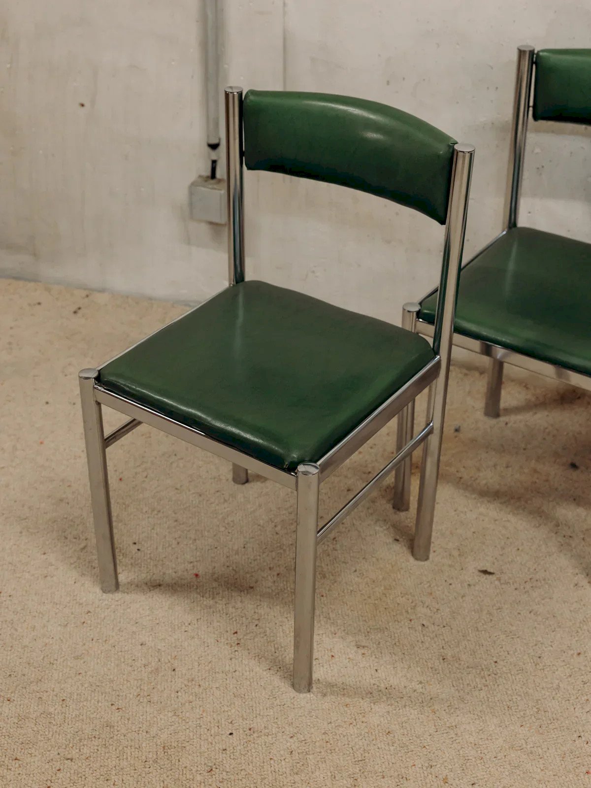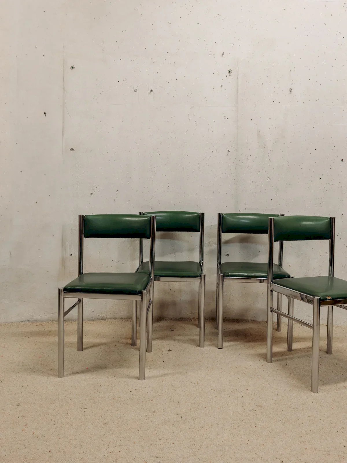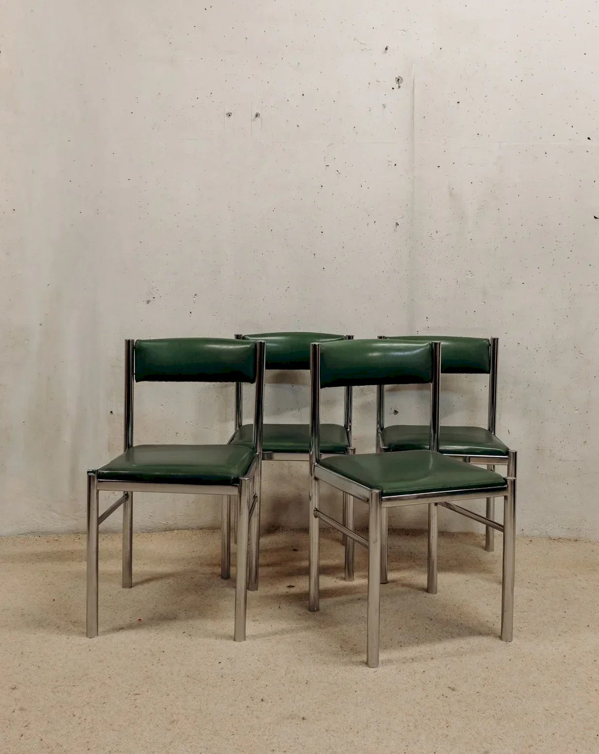 Adoptez cette série de quatre chaises Space Age des années 70-80, animées par une structure tubulaire chromée qui dessine une silhouette légère et graphique. L'assise et le dossier en skaï vert apportent une touche de couleur rétro, facile à entretenir, idéale autour d'une table à manger ou pour aménager un coin repas convivial. Leur profil élancé respecte l'espace et s'intègre aussi bien dans un intérieur contemporain que vintage, créant une atmosphère à la fois ludique et élégante. Largeur : 42 cm Profondeur : 39 cm Hauteur : 77 cm Hauteur d'assise : 42 cm État:Occasion: Objet ayant été utilisé. Objet présentant quelques marques d'usure superficielle, ...Occasion: Objet ayant été utilisé. Objet présentant quelques marques d'usure superficielle, entièrement opérationnel et fonctionnant correctement. Il peut s'agir d'un modèle de démonstration ou d'un objet retourné en magasin après une courte période d'utilisation. les éventuelles imperfections. Couleur:Multicouleur Hauteur:Chrome, Skaï Largeur:Chaises Marque:Debongout Type:Produit chiné Matériau:Chrome, Skaï Style:Contemporain