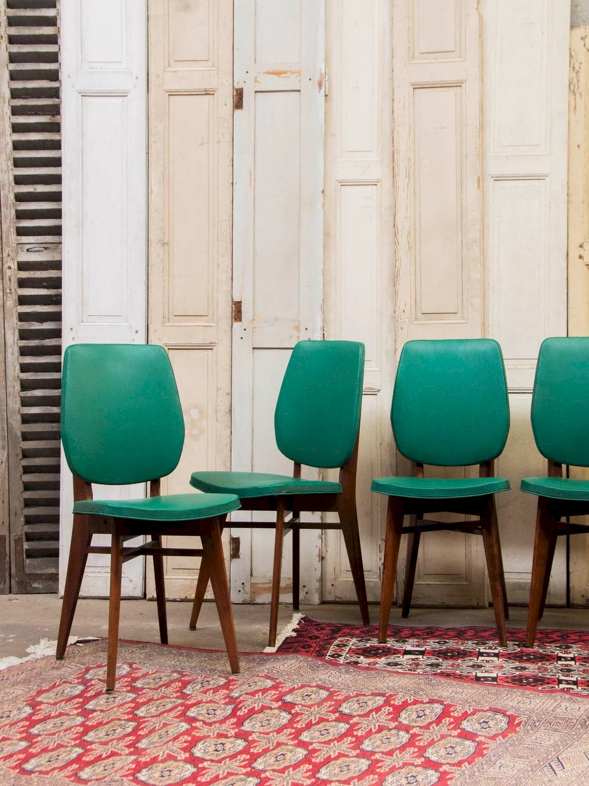 Invitez une touche rétro-chic avec ce lot de six chaises en vinyle vert, au revêtement lisse et facile d'entretien, idéal pour une salle à manger chaleureuse. Les pieds fins en bois foncé vernis affinent la silhouette et apportent une élégance discrète, tandis que les assises compactes et les dossiers légèrement hauts offrent un confort adapté aux repas et aux conversations prolongées. Polyvalentes, elles s'intègrent aussi bien dans un intérieur contemporain que dans une ambiance vintage, créant une atmosphère accueillante et stylée. Usures légères présentes. Largeur : 40 cm Profondeur : 44 cm Hauteur : 89 cm Hauteur d'assise : 47 cm Profondeur de l'assise : 34 cm Largeur de l'assise : 40 cm État:Occasion: Objet ayant été utilisé. Objet présentant quelques marques d'usure superficielle, ...Occasion: Objet ayant été utilisé. Objet présentant quelques marques d'usure superficielle, entièrement opérationnel et fonctionnant correctement. Il peut s'agir d'un modèle de démonstration ou d'un objet retourné en magasin après une courte période d'utilisation. les éventuelles imperfections. Couleur:Multicouleur Hauteur:Vinyle, Bois Largeur:Chaises Marque:Debongout Type:Produit chiné Matériau:Vinyle, Bois Style:Contemporain