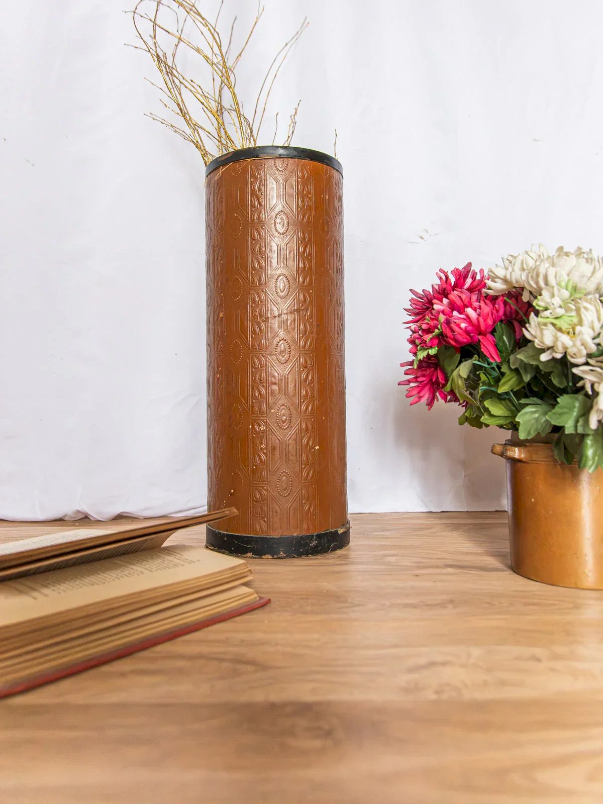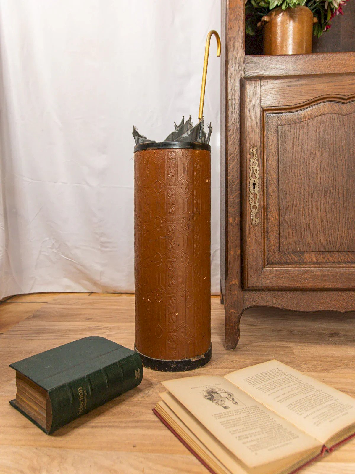 Sublimez votre entrée avec ce porte-parapluie en simili cuir couleur camel rehaussé d'un liseré noir, qui apporte une note chaude et structurée à l'espace. Conçu pour accueillir plusieurs parapluies tout en restant discret par ses proportions élancées, il joue la carte du fonctionnel chic pour vestibules et bureaux. La matière patinée et le contraste du liseré soulignent un style raffiné et intemporel, idéal pour une ambiance parisienne sobre et accueillante. Eraflures et traces du temps présentes. Hauteur : 53 cm Diamètre : 20 cm État:Occasion: Objet ayant été utilisé. Objet présentant quelques marques d'usure superficielle, ...Occasion: Objet ayant été utilisé. Objet présentant quelques marques d'usure superficielle, entièrement opérationnel et fonctionnant correctement. Il peut s'agir d'un modèle de démonstration ou d'un objet retourné en magasin après une courte période d'utilisation. les éventuelles imperfections. Marque:Debongout Type:Produit chiné Matériau:Simili cuir, Cuir, Carton, Métal Style:Campagne