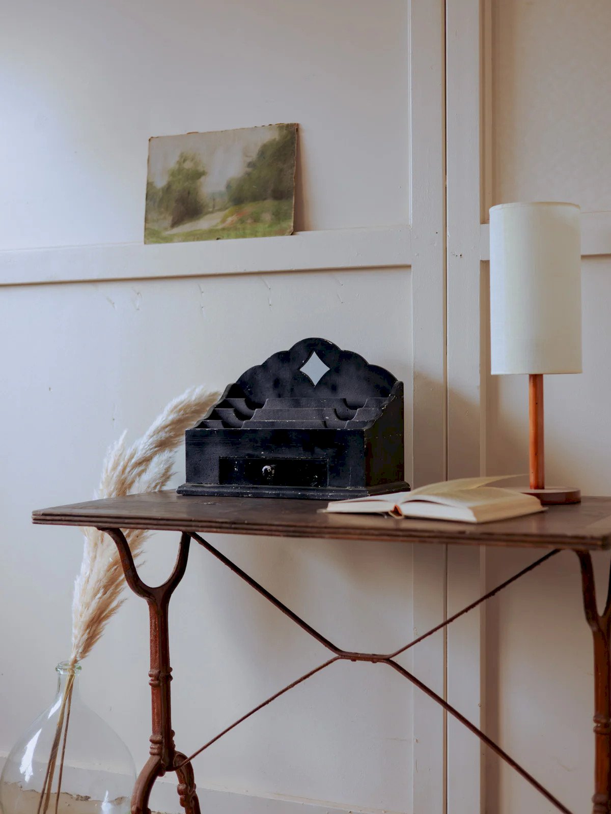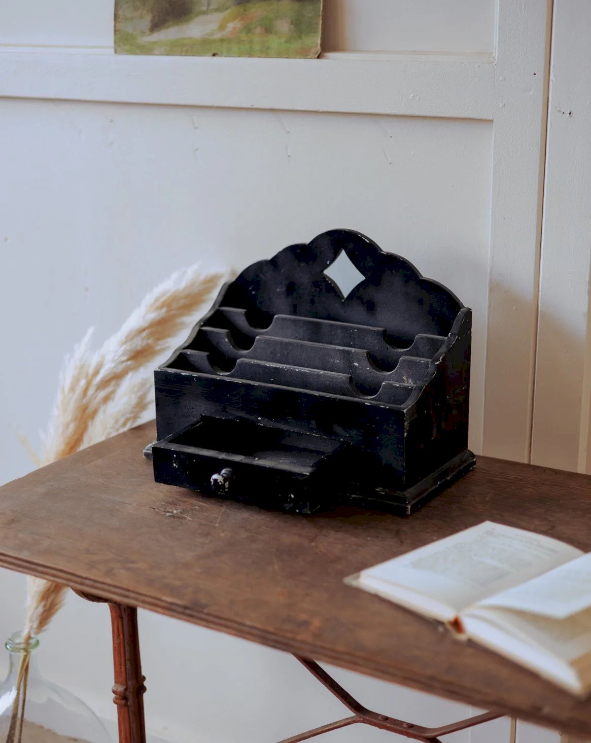 Découvrez ce tri-courrier noir au design fonctionnel, doté d'un tiroir central et d'un bel espace de rangement pour courrier, factures et petits objets du quotidien. Sa peinture noire et sa silhouette graphique évoquent un style sobre, presque atelier, qui s'intègre avec élégance dans une entrée ou un bureau, apportant organisation et caractère sans surcharge. Sa construction robuste privilégie l'usage pratique au quotidien tout en maintenant une esthétique épurée. Éclats de peinture laissant apparaître l'apprêt par endroits, traces du temps visibles. Longueur : 40 cm Largeur : 19,5 cm Hauteur : 29,5 cm Hauteur tiroir : 3,5 cm État:Occasion: Objet ayant été utilisé. Objet présentant quelques marques d'usure superficielle, ...Occasion: Objet ayant été utilisé. Objet présentant quelques marques d'usure superficielle, entièrement opérationnel et fonctionnant correctement. Il peut s'agir d'un modèle de démonstration ou d'un objet retourné en magasin après une courte période d'utilisation. les éventuelles imperfections. Marque:Debongout Type:Produit chiné Matériau:Bois Style:Campagne