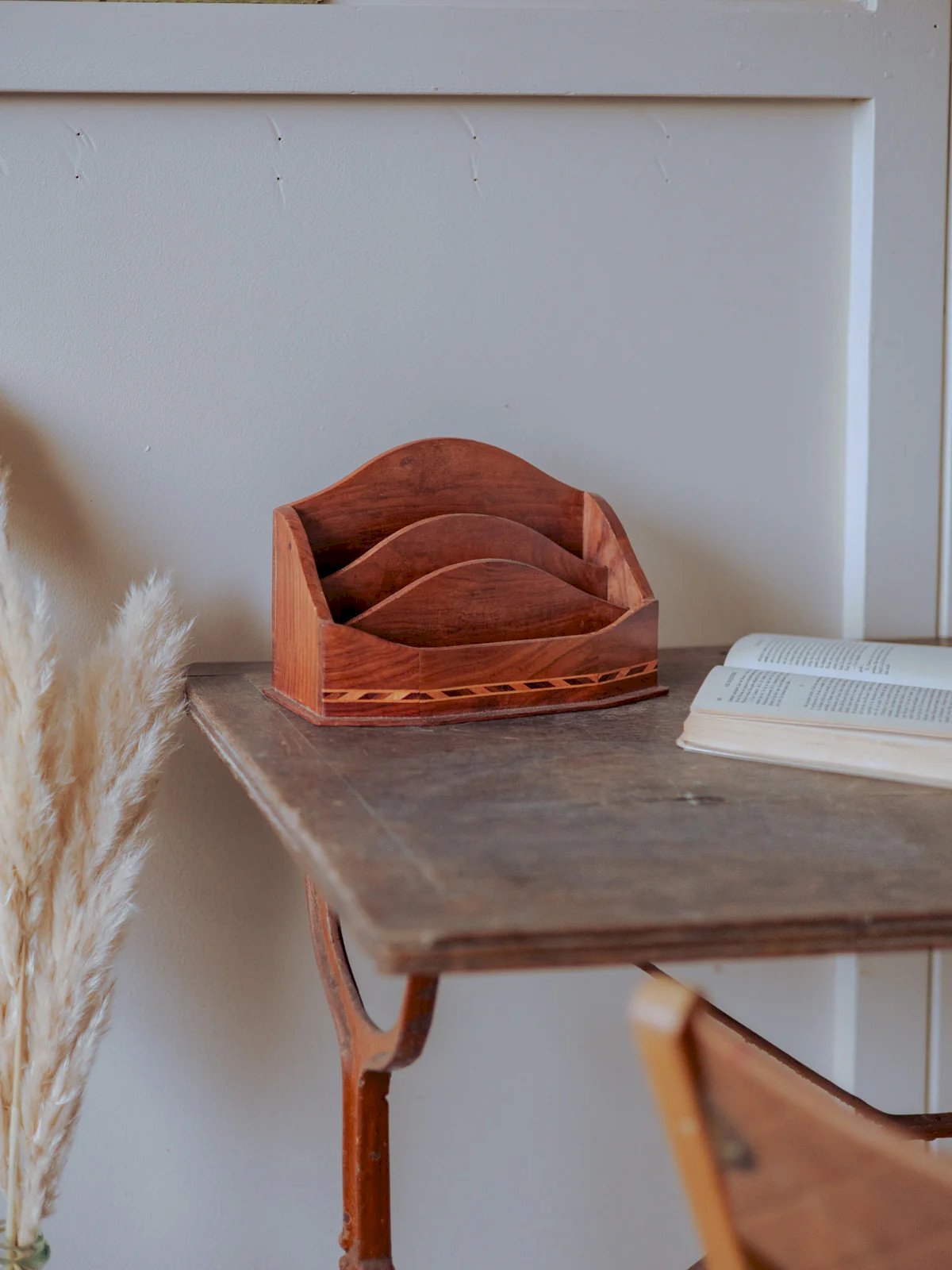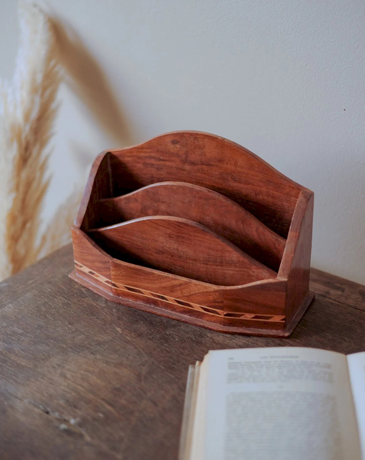 Apportez une touche d'élégance avec ce porte‑lettres en bois marqueté, doté de trois compartiments pour organiser courrier, factures et petits documents avec clarté. La marqueterie latérale, finement travaillée, offre un motif discret qui capte la lumière et souligne l'artisanat de l'objet. Aux proportions équilibrées et à l'allure sobre, il trouve sa place sur un bureau, une console d'entrée ou une étagère, instaurant une atmosphère chaleureuse et ordonnée. Longueur : 28 cm Largeur : 9 cm Hauteur : 18 cm Espacement entre compartiments : 3 cm État:Occasion: Objet ayant été utilisé. Objet présentant quelques marques d'usure superficielle, ...Occasion: Objet ayant été utilisé. Objet présentant quelques marques d'usure superficielle, entièrement opérationnel et fonctionnant correctement. Il peut s'agir d'un modèle de démonstration ou d'un objet retourné en magasin après une courte période d'utilisation. les éventuelles imperfections. Marque:Debongout Type:Produit chiné Matériau:Bois Style:Campagne