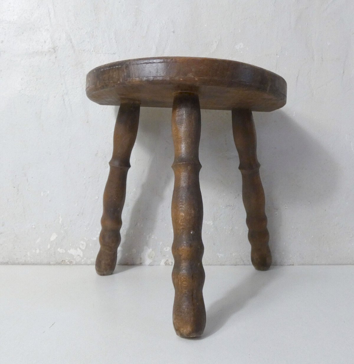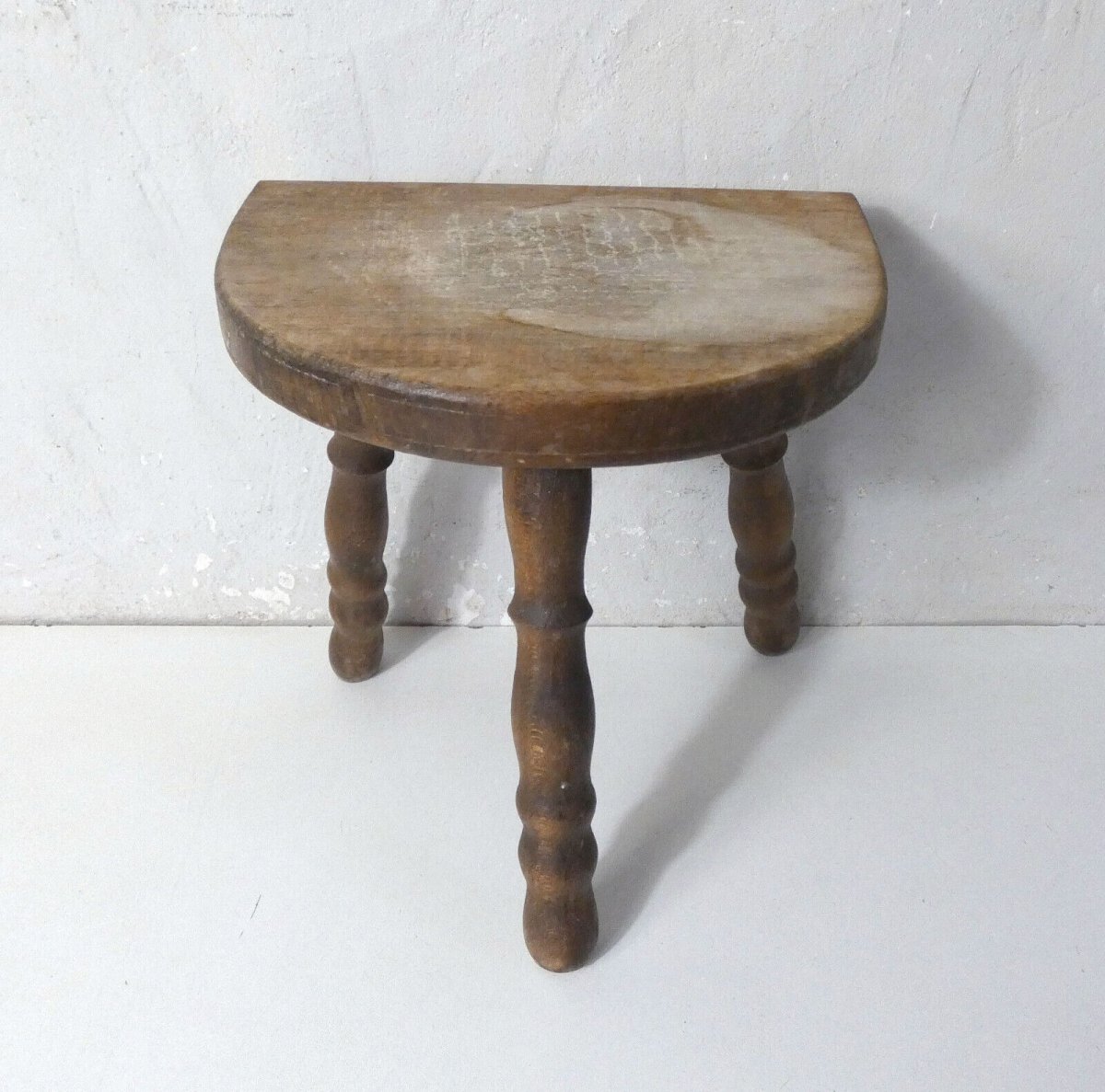 Ancien petit banc de traite, tripode demie-lune, en bois massif. Hauteur: 27 cm. Largeur: 25 cm. Profondeur: 17 cm. En très bon état. Parfaitement fonctionnel. Décoloration au niveau de l'assise comme trace d'usage superficielle: selon les gouts il pourra être poncé et ciré. Peint ou laissé avec son vécu pour une touche d'authenticité.