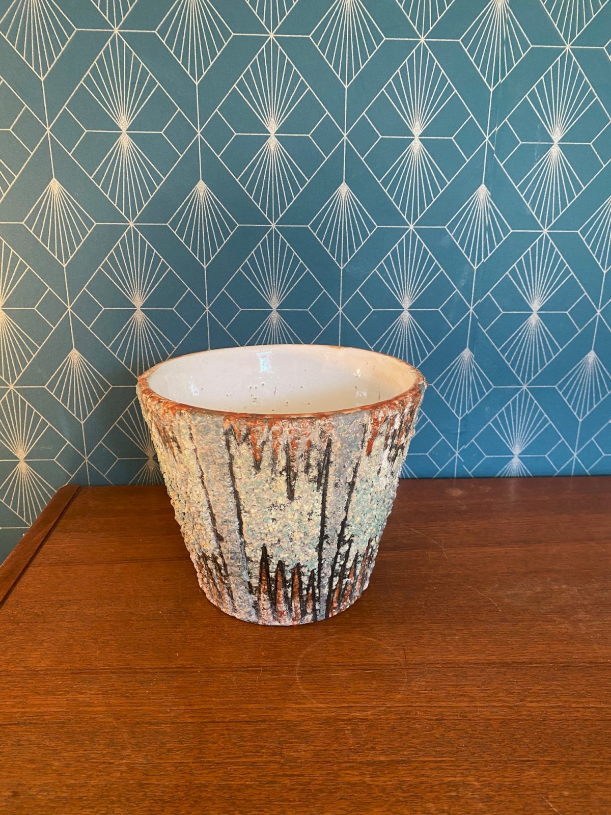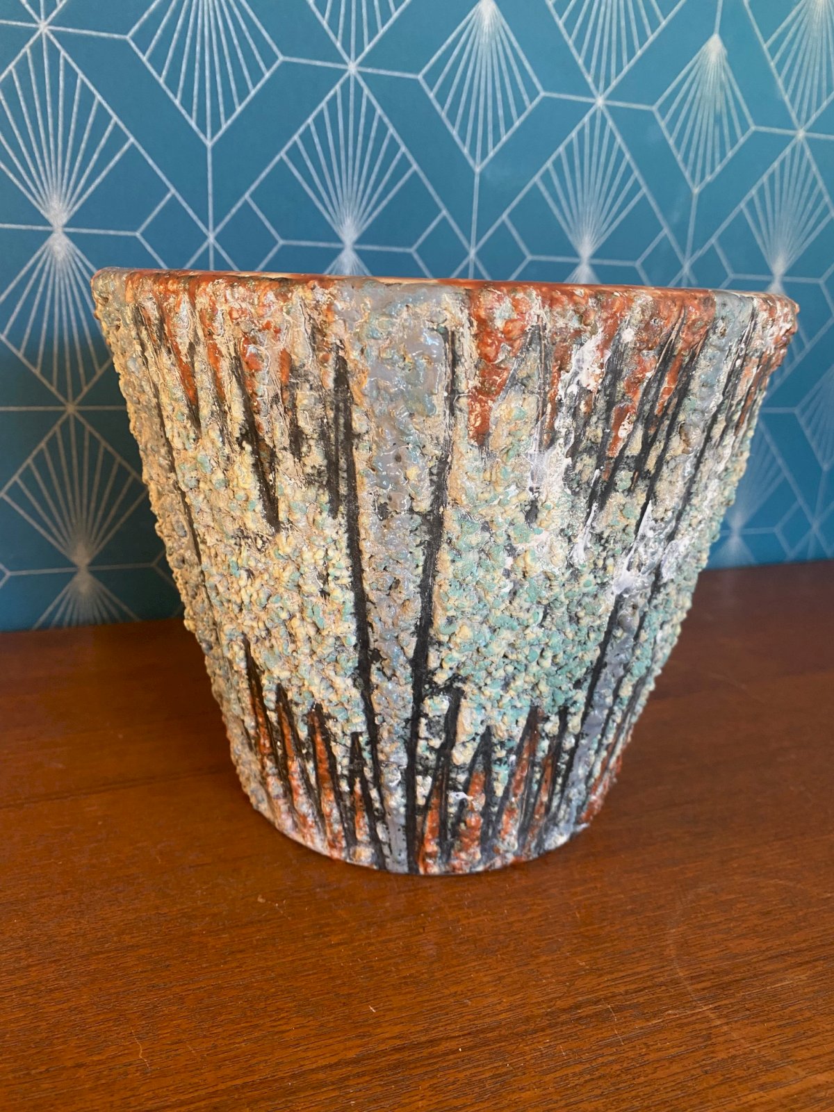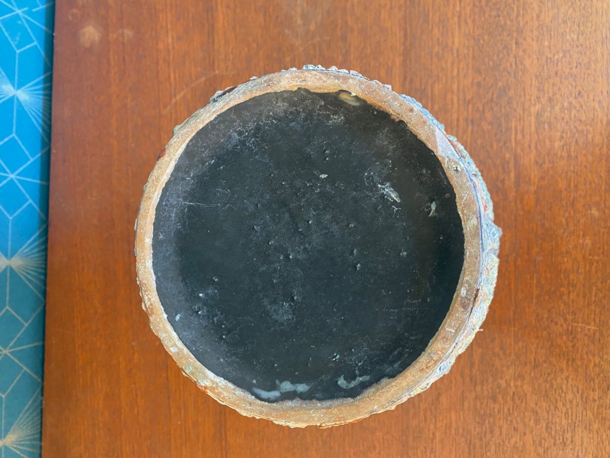Magnifique cache pot en terre cuite émaillée, de forme tronconique et texturé dans les tons turquoise et orange à décors de pointes. Ecole de Romacréa, groupement d'artistes devenu fabrique, puis école d'art en 1950 à Rome. Pièce unique qui mesure 17cm de haut pour 20,5 de diamètre. Belle affaire!!