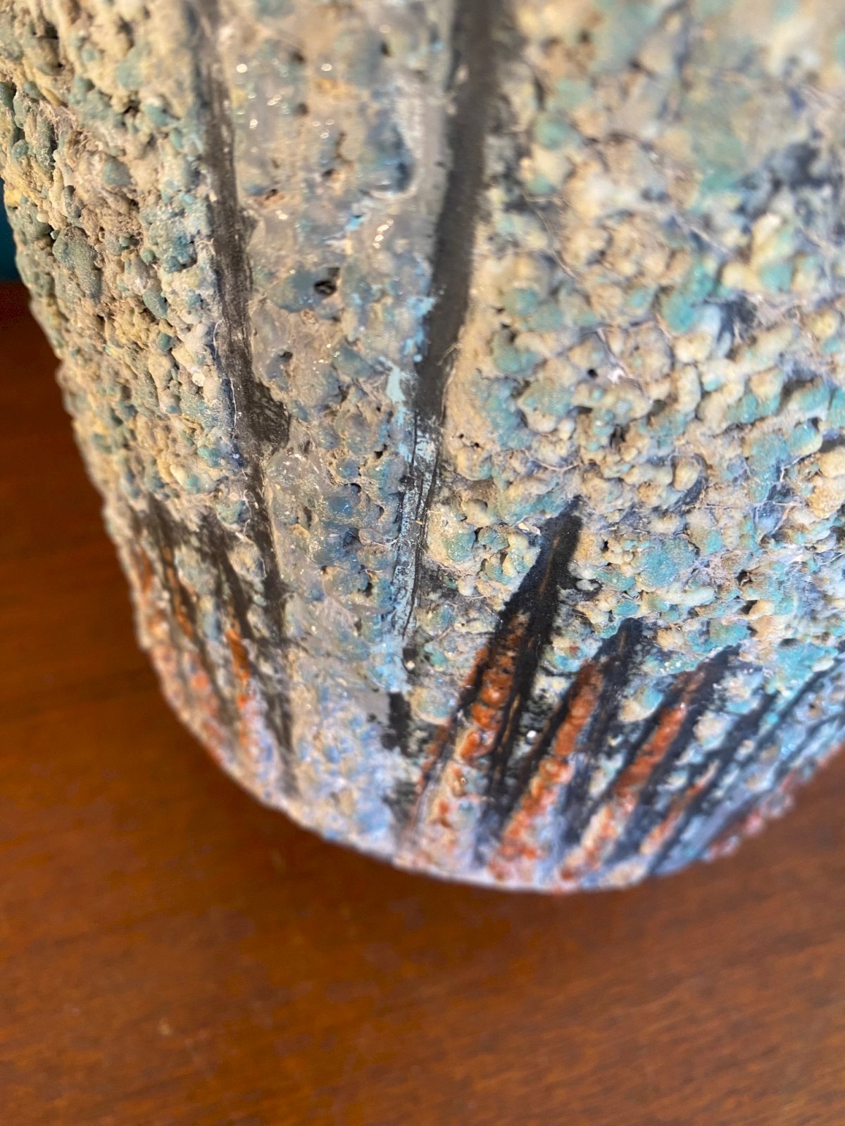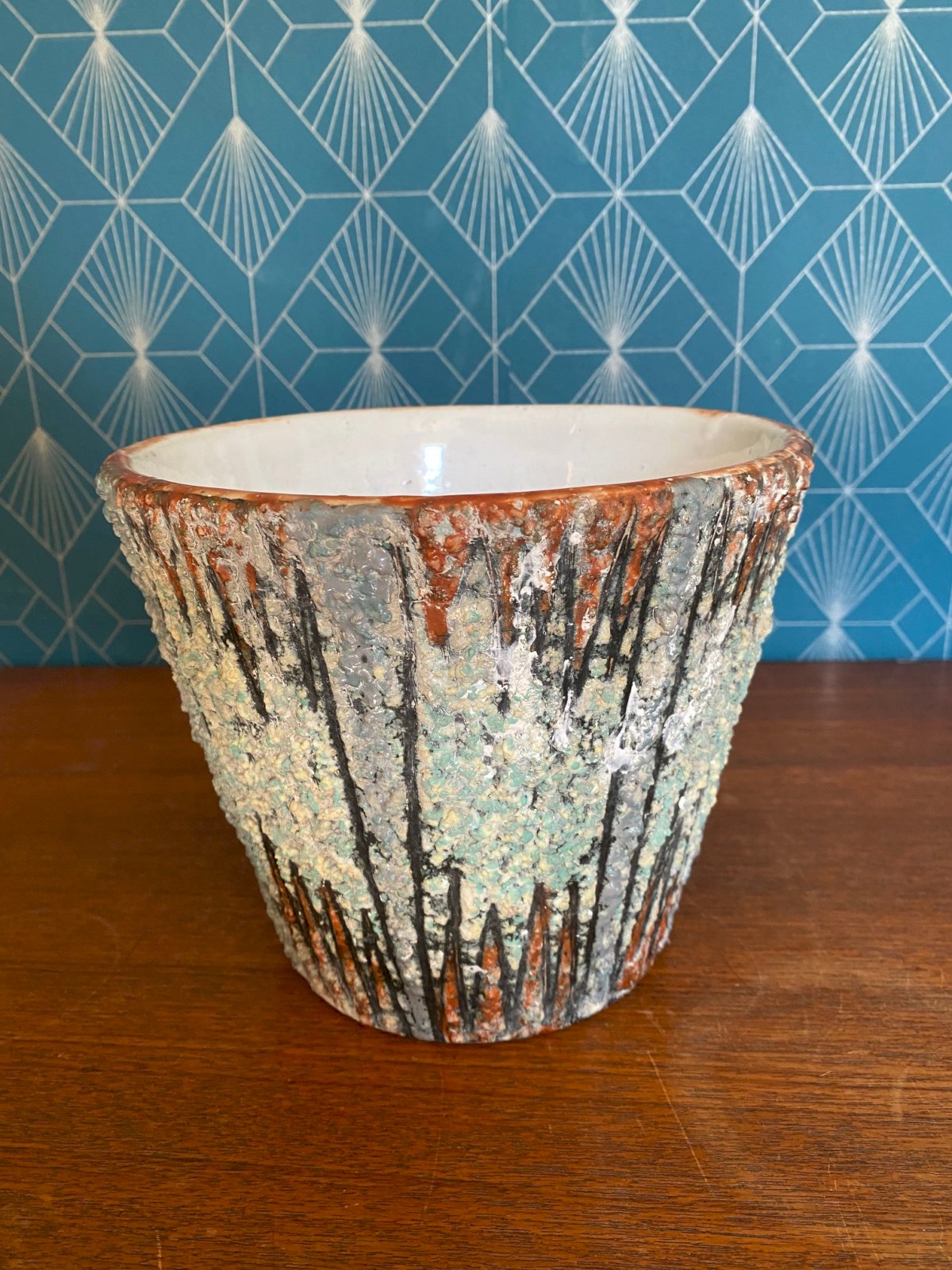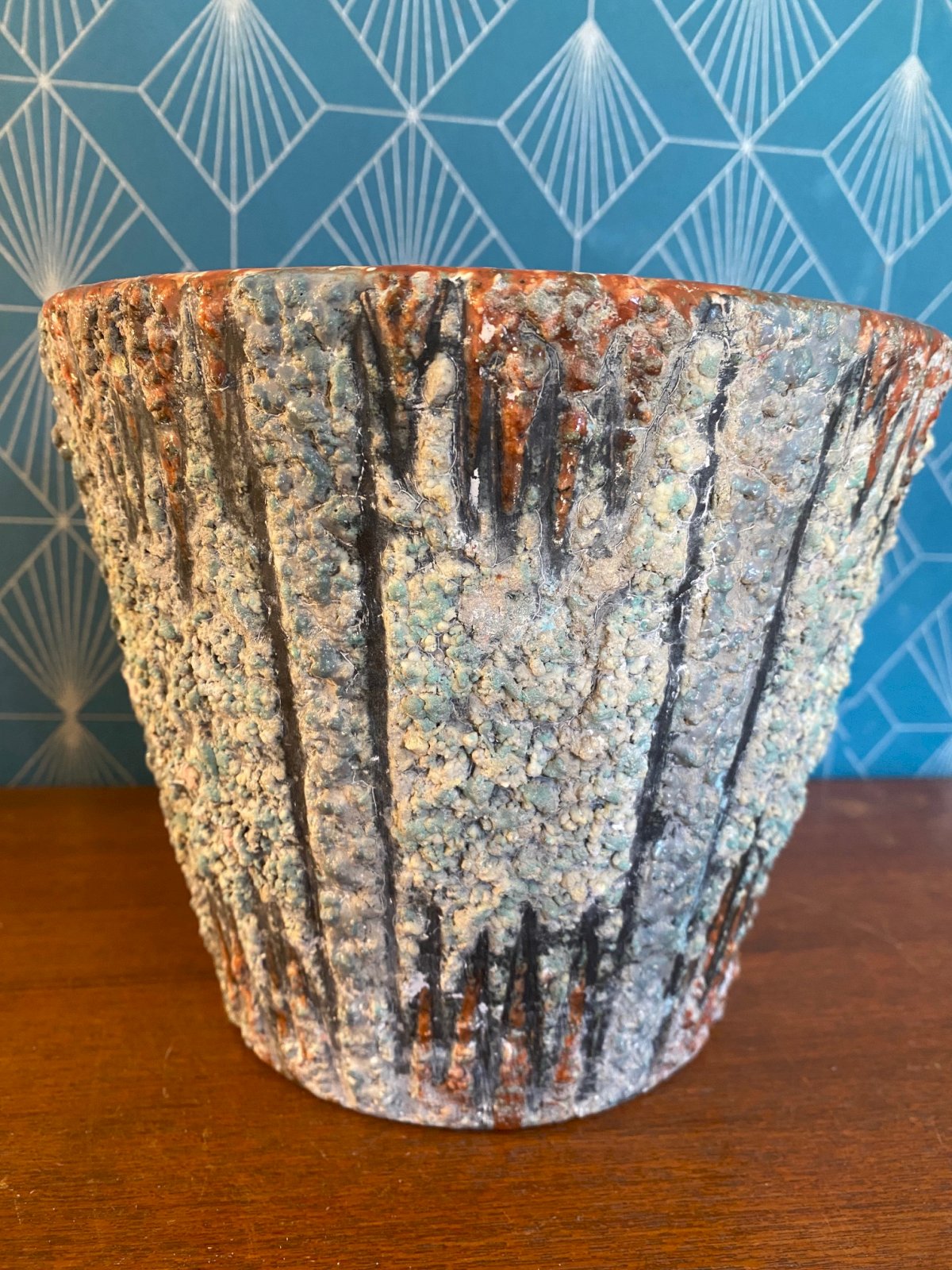 Magnifique cache pot en terre cuite émaillée, de forme tronconique et texturé dans les tons turquoise et orange à décors de pointes. Ecole de Romacréa, groupement d'artistes devenu fabrique, puis école d'art en 1950 à Rome. Pièce unique qui mesure 17cm de haut pour 20,5 de diamètre. Belle affaire!!