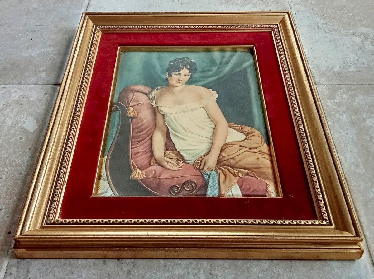 Ancien Cadre Doré Velours rouge Reproduction Sur Tissu Satiné De Mme Récamier Par François Gérard Très chic Bon état Dimensions cadre 28.5 cm x 34.5 cm Dimensions reproduction 17cm x 22.6 cm Authenticité:Reproduction Sous-type:Cadre