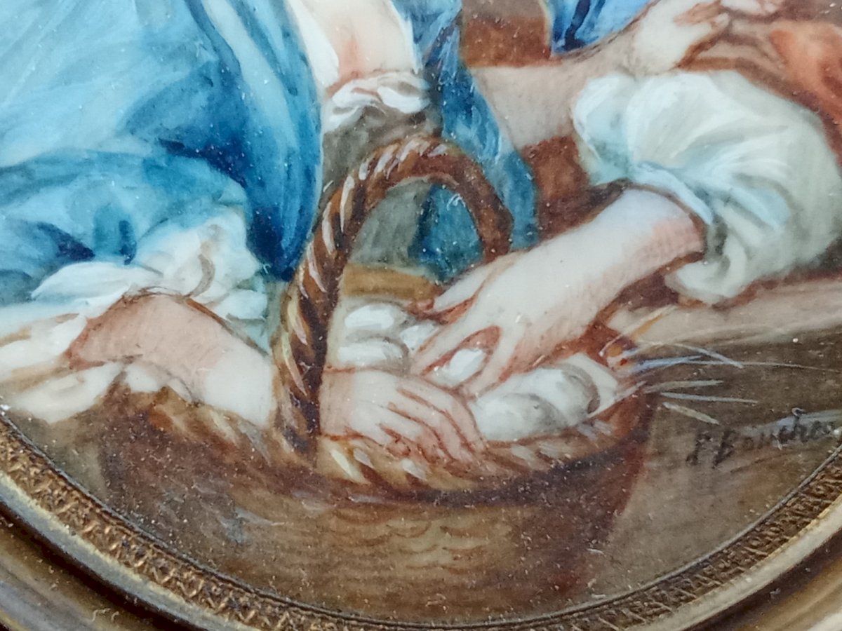 Ancien Cadre portrait Peinture Miniature Marchande Oeuf 18 Ème Siècle F. Boucher