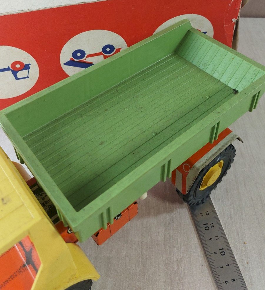 Ancien camion à friction, en tôle et plastique, benne basculante, URSS en bon état, des usures, manque un phare, à nettoyer la friction ne fonctionne plus trop, les manivelles ne fonctionnent plus avec boîte d'origine  longueur 27 cm voir photos  Consultez mes autres objets  !  réduction des frais de port en cas d'achat groupé État:OccasionObjet ayant été utilisé. les éventuelles imperfections. Type du véhicule:Camion Marque:inconnue