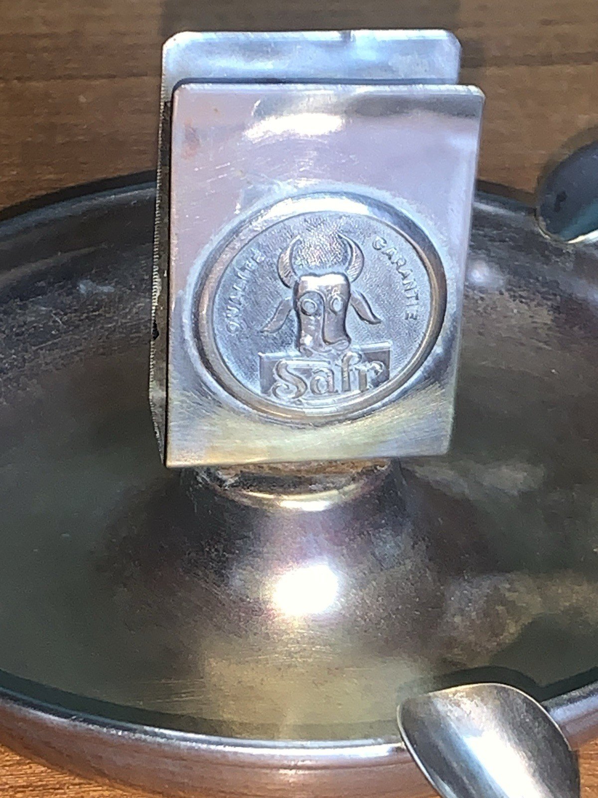 Ancien cendrier publicitaire Laiton  SAFR (Société anonyme des fermiers réunis) Les grandes fromageries Décor d'une tête de vache Diamètre:15cm Hauteur:7,5cm Authenticité:Original Marque:SAFR Type:Objet de vitrine, Décoratif Période:Art Déco Origine:France Pays d'origine:France Sous-type:cendrier Matière:Laiton Style:publicitaire