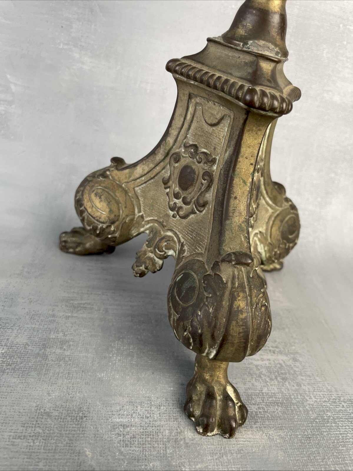 Ancien crucifix croix d'autel en laiton ou bronze patiné tripode ~54cm Antique crucifix altar cross in patinated brass or bronze tripod ~54cm Hauteur ~ 54 cm Poids ~ 1.5 kg Bel patine, quelques déformations, anciennes soudure, manque une fixation du christ, voir photos. Pensez à grouper vos achats pour réduire les frais de port ! Couleur:Bronze Matière:Bronze Pays d'origine:France métropolitaine
