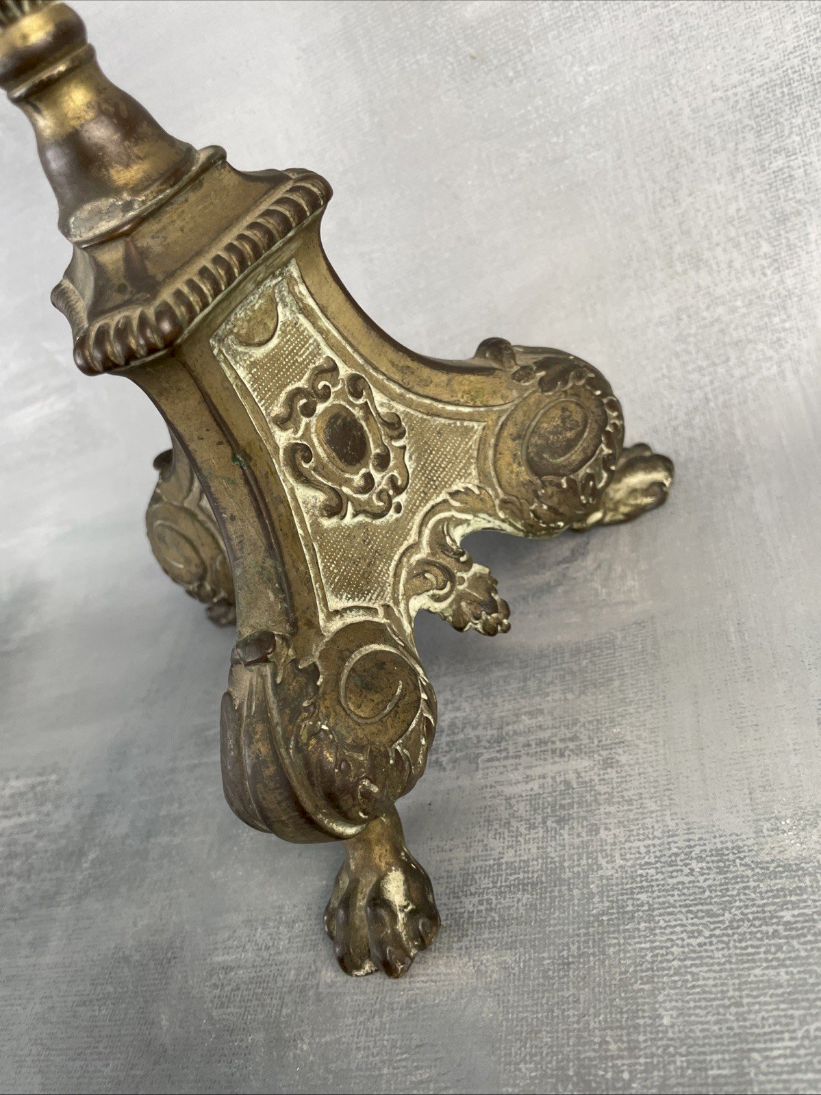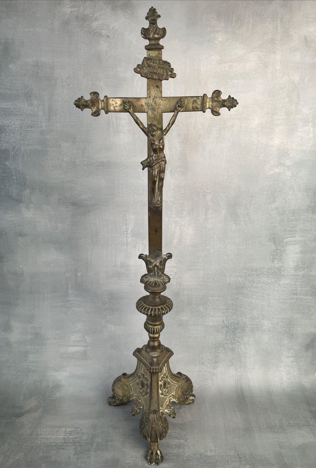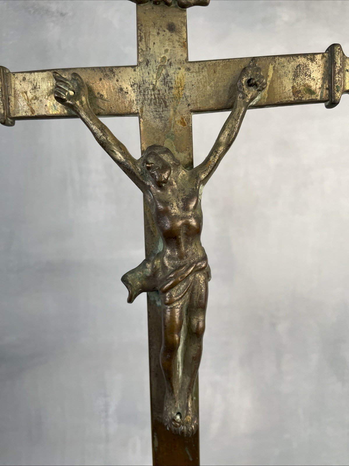 Ancien crucifix croix d'autel en laiton ou bronze patiné tripode ~54cm