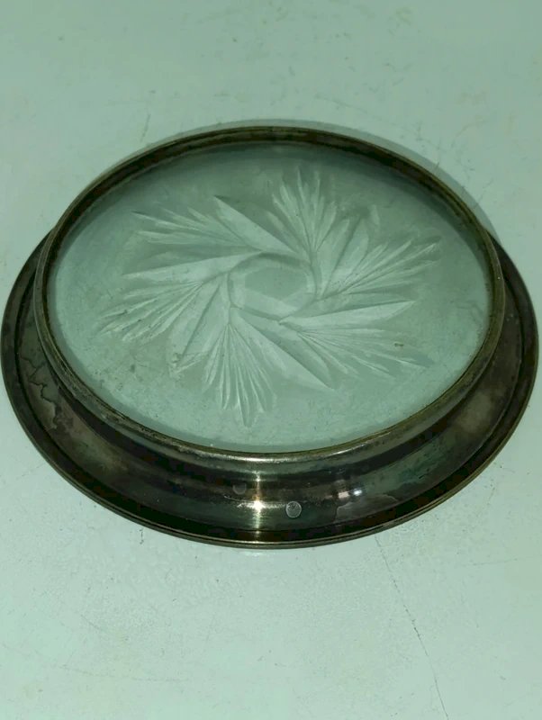 ancien dessous de bouteille en cristal et metal argenté en bon etat Gris