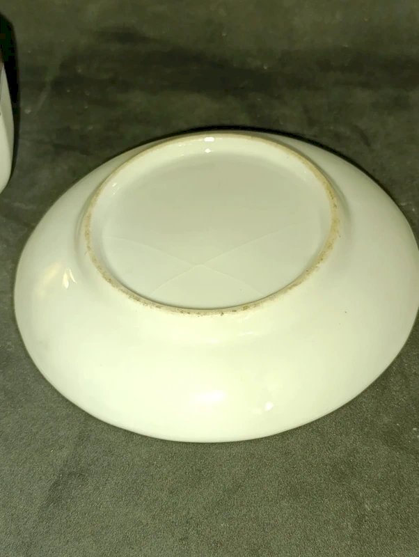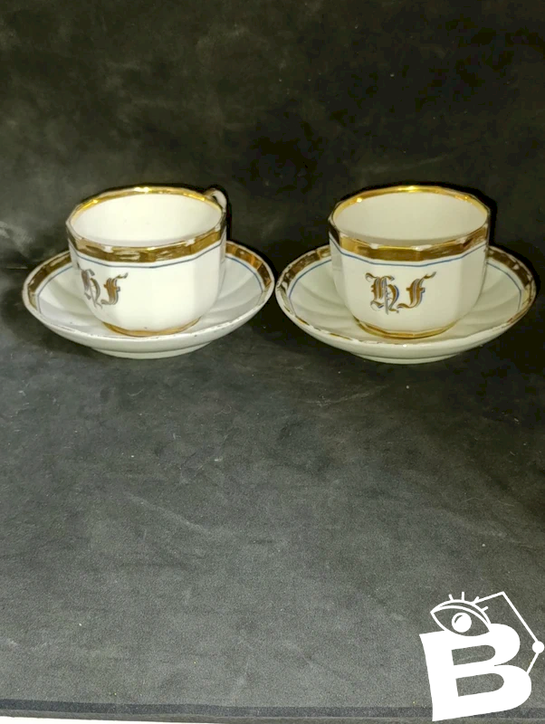 ancien duo de tasses et soucoupe en porcelaine avec dorure et monogramme en bon etat quelques veinages dans le vernis et usures de la dorure (voir photos) diametre 8cm hauteur 5.5cm pour les tasses et diametre 13cm pour la soucoupe...