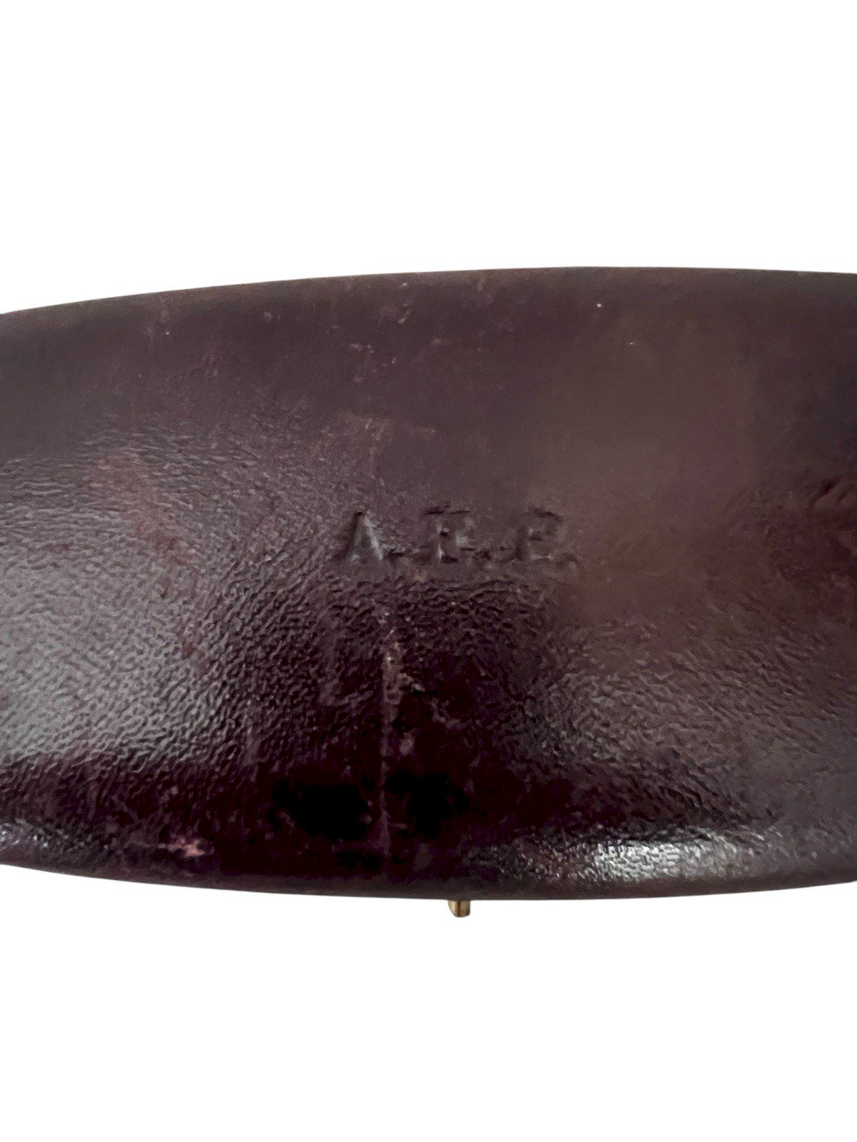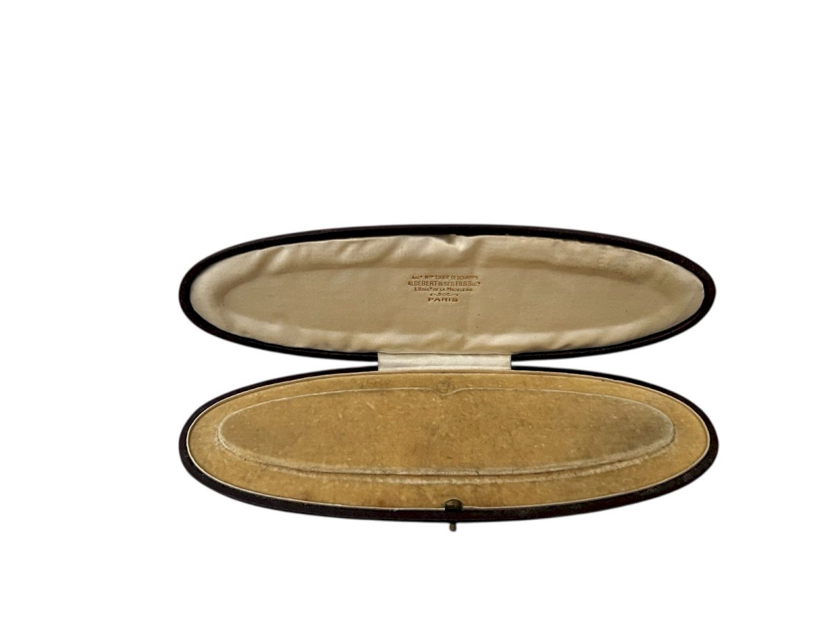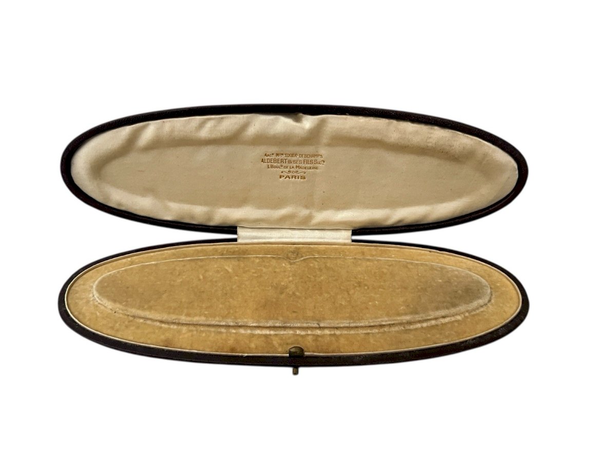 Ancien écrin pour collier de la maison Aldebert & ses Fils, successeurs de Tixier-Deschamps, situé au 1 boulevard de la Madeleine à Paris. Ce coffret de forme ovale allongée est un témoignage du raffinement de la joaillerie parisienne du XIXe siècle. L'extérieur est en cuir bordeaux présentant un décor aux initiales A.F.E. frappées à froid sur le couvercle. L'intérieur est gainerie d'origine, alliant une soie creme délicate sous le couvercle et un velours de protection pour le bijou. L'objet mesure environ 23 cm de longueur, environ 8,5 cm de largeur et environ 2 cm de hauteur, pour un poids d'environ 113 g. L'état général est bon avec un système de fermeture impeccable, bien que le cuir présente quelques rayures et usures d'usage normales pour son âge. Authenticité:Original Poids:19,58grs Hauteur:2 Cms Matière:Cuir/ Soie/ Velours Longueur:23 Cms Largeur:8,5cms Type:Objet de vitrine, Décoratif Marque:Aldebert Origine:France Pays d'origine:France Sous-type:Bijou Style:Napoléon III
