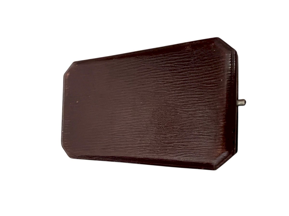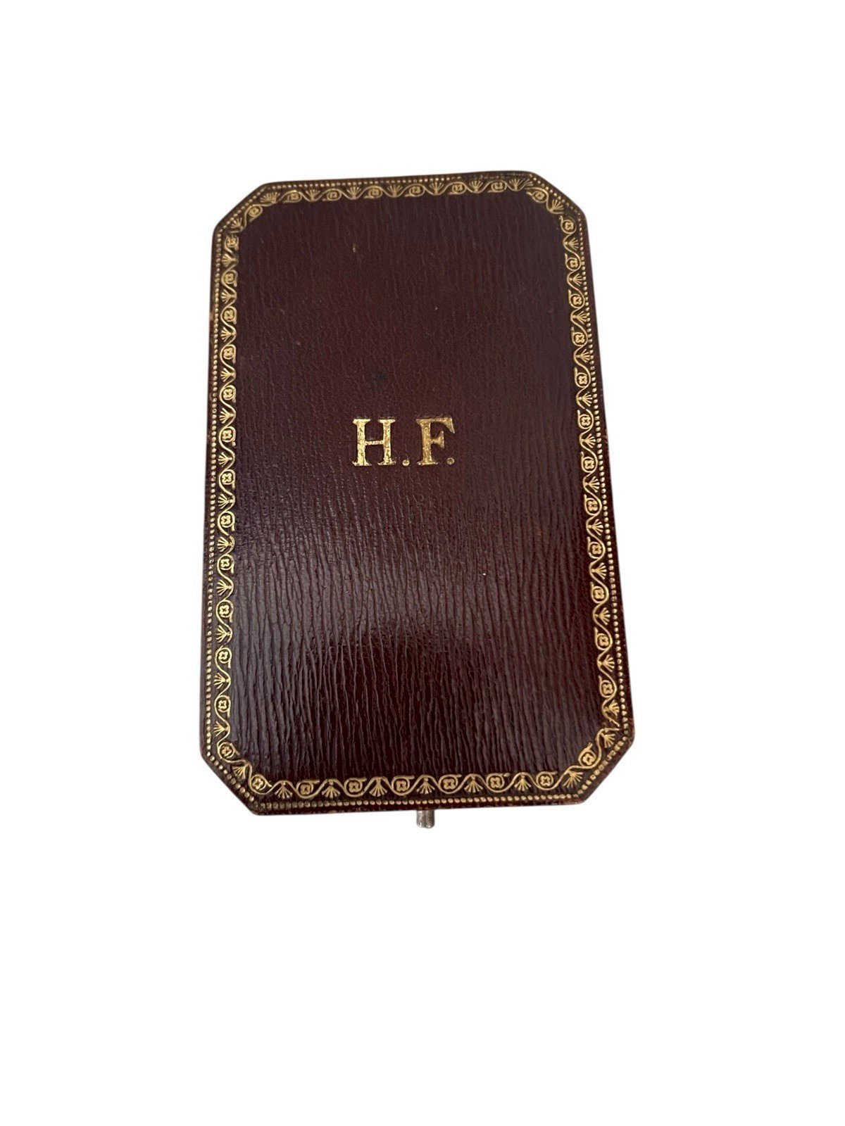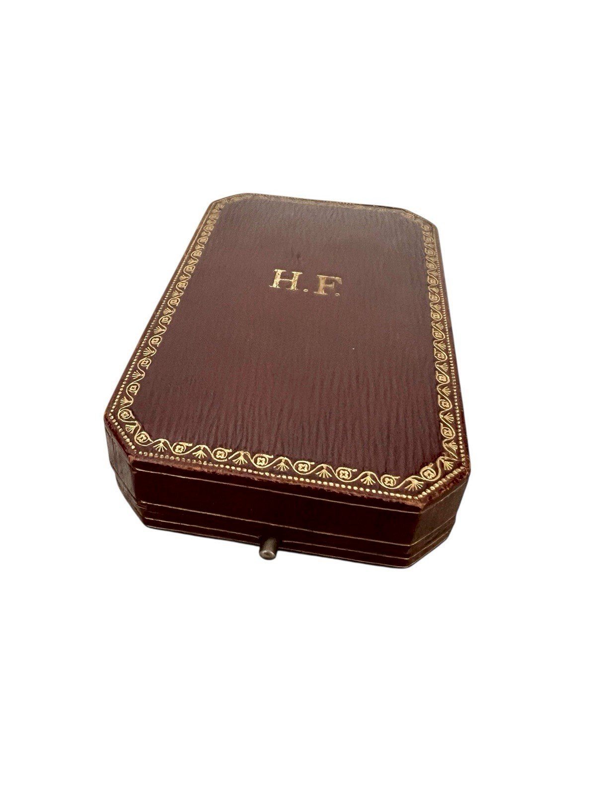 La maison Fontana est l’une des signatures les plus prestigieuses de la joaillerie parisienne du XIXe siècle. Fondée en 1840 par Thomas Fontana au Palais-Royal, l’enseigne devient Ch. Fontana & Cie en 1871. Cet écrin, marqué « Fontana Frères » et mentionnant l'adresse du 7 rue de la Paix ainsi qu'une succursale à Nice, témoigne de l'expansion de la maison après son départ du Palais-Royal en 1896. Célèbre pour ses bijoux de tête et ses parures d'une finesse exceptionnelle, la maison Fontana a fourni les plus grandes cours d'Europe avant que ses archives ne soient finalement intégrées à celles de la maison Chaumet. Ancien écrin de joaillerie de la célèbre maison Fontana Frères, successeurs de la maison du Palais-Royal. Ce coffret de grande taille, datant du tournant du XIXe et du XXe siècle, présente les adresses prestigieuses du 7 rue de la Paix à Paris et du 46 avenue Masséna à Nice. L'extérieur est en cuir bordeaux richement décoré d'une frise de grecques dorées sur le pourtour et marqué des initiales H.F. sur le dessus. L'intérieur est gainerie d'origine en soie et velours beige, idéal pour un accessoire de type objet de vitrine. Ses dimensions sont d'environ 11 cm de long, environ 6,7 cm de large et environ 2,8 cm de hauteur. L'ensemble est en bon état général avec un cuir au design légèrement plissé d’origine et de très légères usures d'usage, le système de fermeture fonctionnant parfaitement. Authenticité:Original Poids:19,58grs Hauteur:2,8cms Matière:Cuir/ Soie/ Velours Longueur:11cms Largeur:6,7cms Type:Objet de vitrine, Décoratif Marque:Ch. Fontana Origine:France Pays d'origine:France Sous-type:Bijou Style:Napoléon III