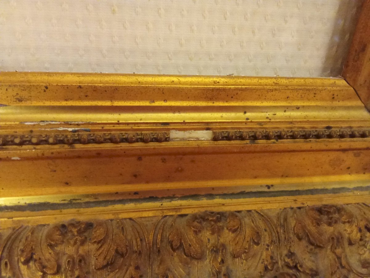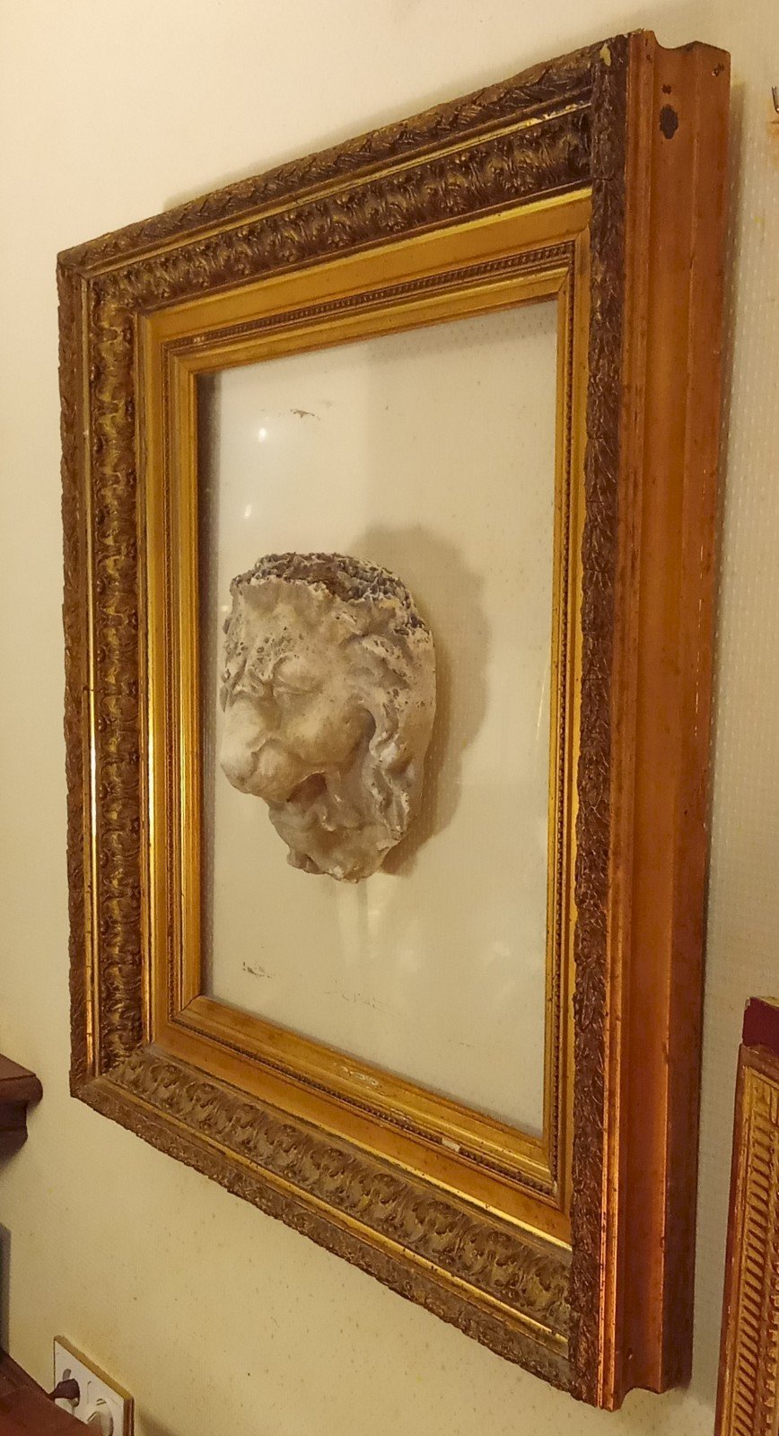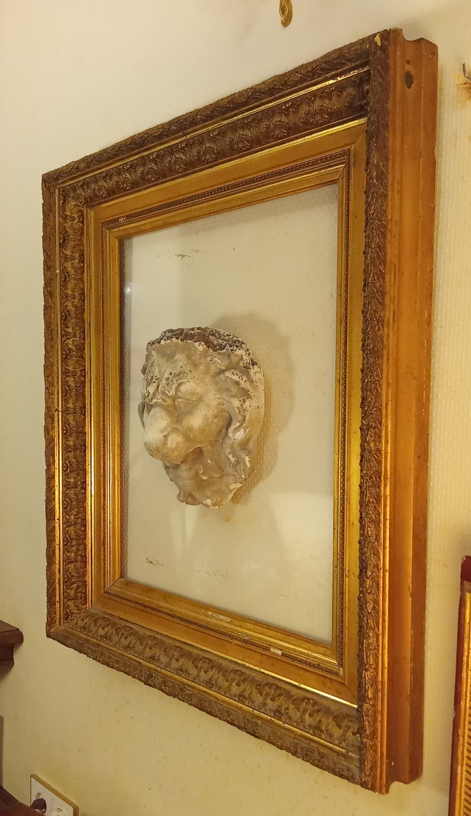 Très belle composition Ancien grand cadre doré Ornement central d' une Tête de Lion en Pierre fixée sur un plexiglas. Magnifique Belle pièce unique Bon état Petits manques sur le cadre voir.photos Dimensions totales 68.1 cm x 78.5 cm Dimensions Plexiglas  47.7 cm x 58 cm Dimensions Lion 21.3 cm x 23.2 cm Livraison possible par transporteur.me contacter pour le tarif selon votre région Sous-type:Cadre Matière:Pierre